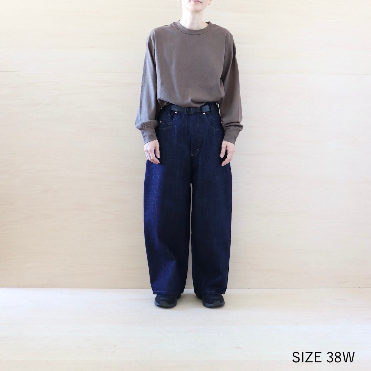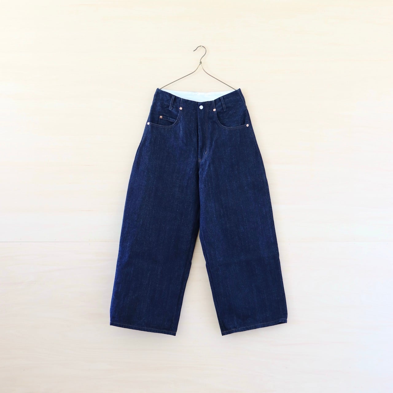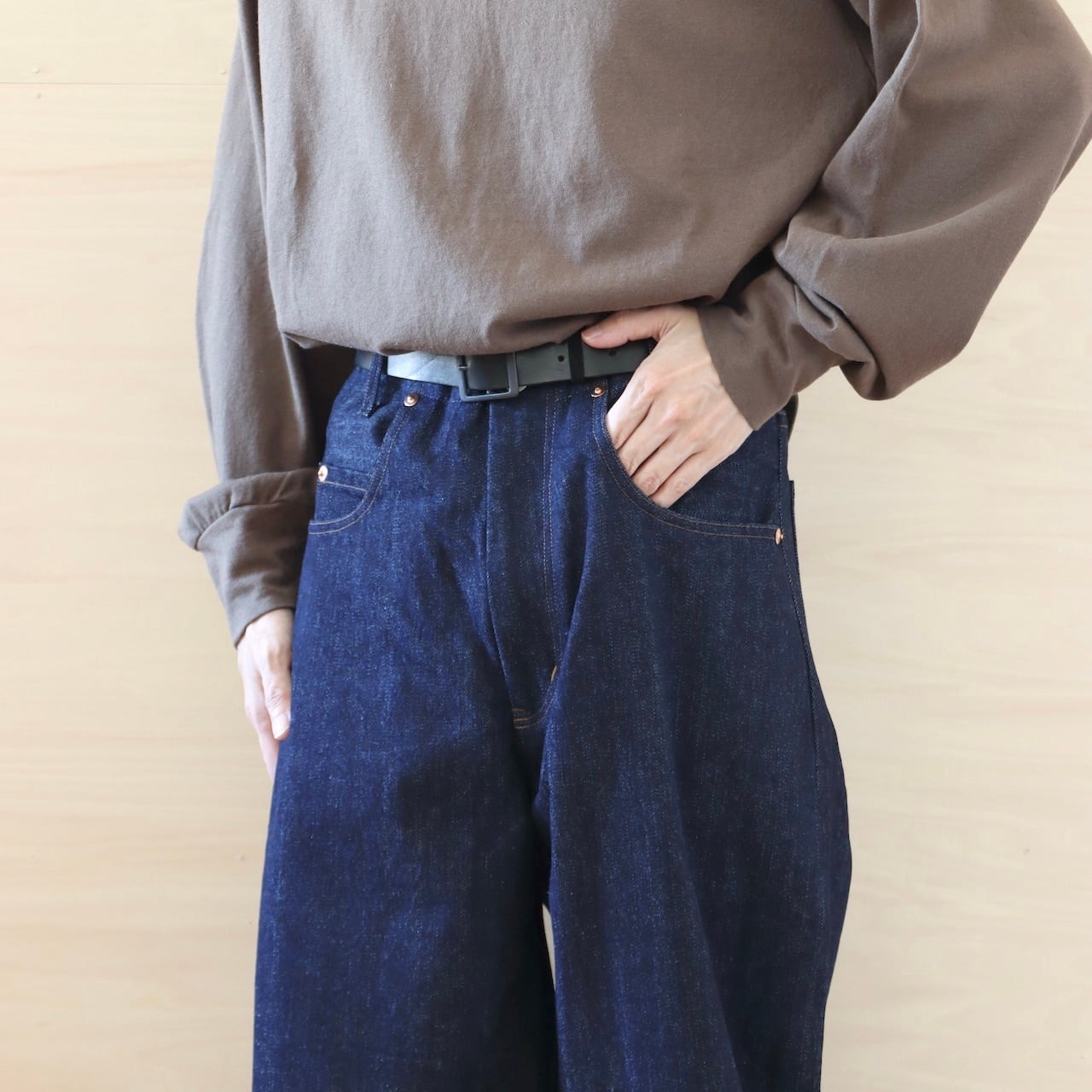 5Pワイドデニムパンツを製作しました。股上を深くとり、腿あたりから裾にかけてゆるやかに窄めることで独特な丸みのあるシルエットに仕上がっています。生地は岡山県児島で織られた12オンスデニムを使用。バイオウォッシュ加工が施されており、程よい柔らかさもあります。縫製後にワンウォッシュしておりますので、極端な縮みはございません。今回よりサイズ展開を増やし、5サイズ展開となります。洗濯は手洗い(押し洗い)をおすすめします。洗濯機を使う場合はひっくり返してネットに入れて洗って頂くことをおすすめします。色落ちしますので他の物と一緒に洗わないで下さい。
