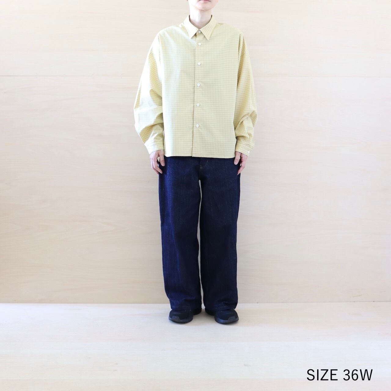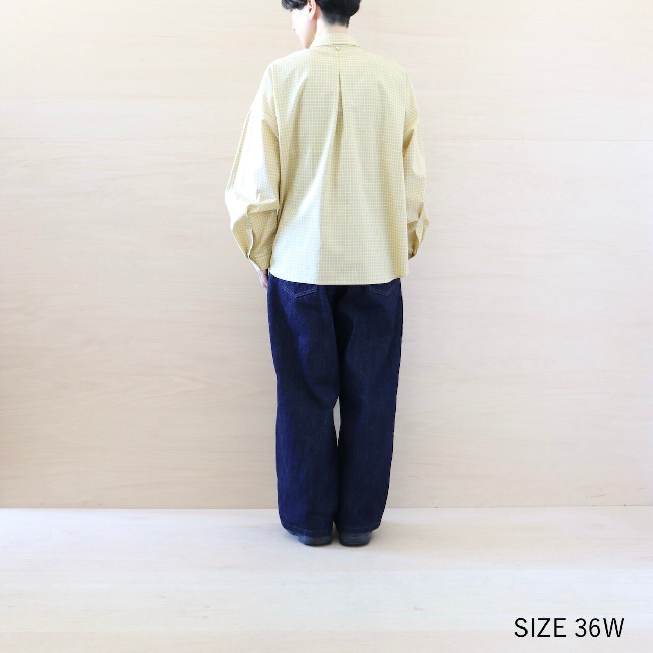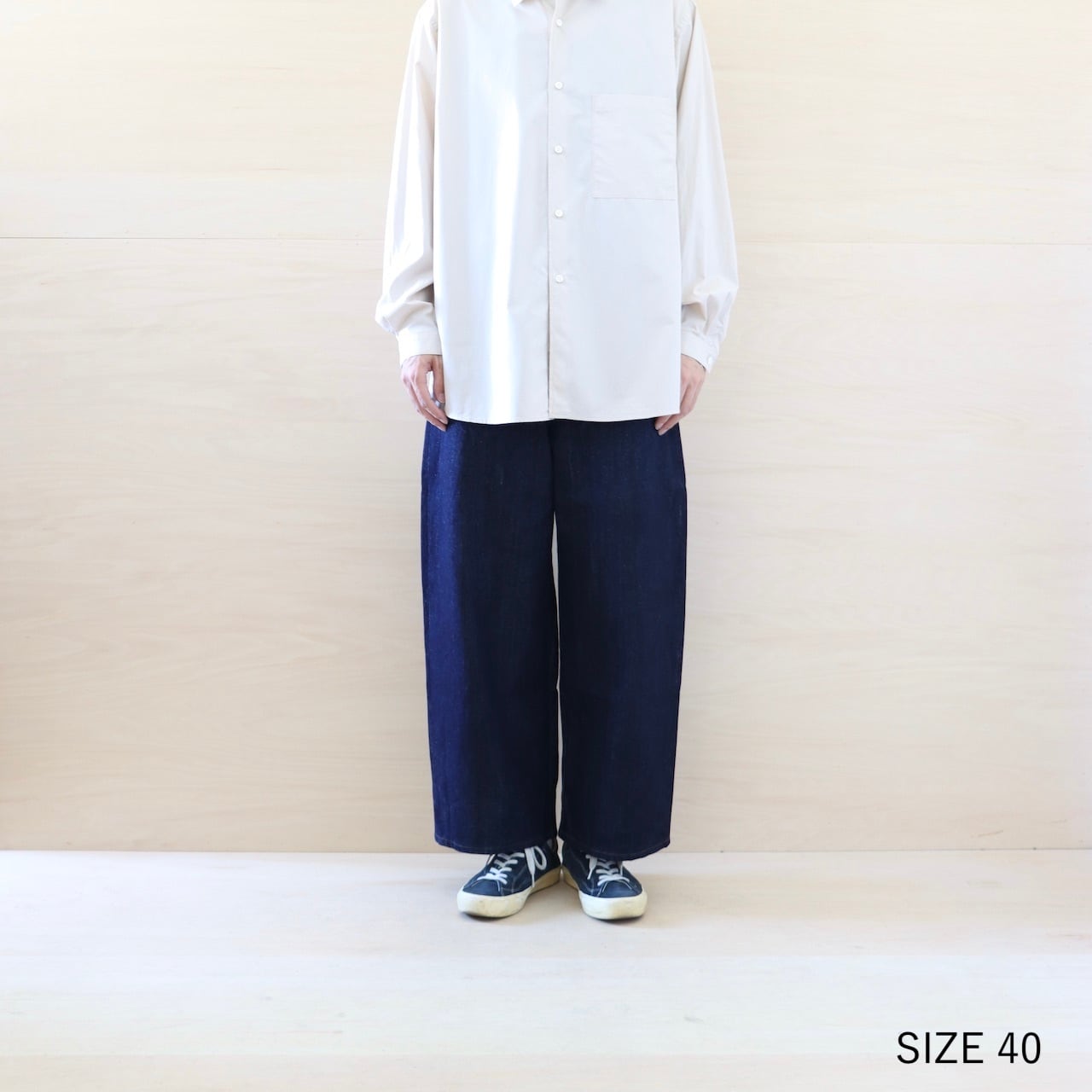 5Pワイドデニムパンツを製作しました。股上を深くとり、腿あたりから裾にかけてゆるやかに窄めることで独特な丸みのあるシルエットに仕上がっています。生地は岡山県児島で織られた12オンスデニムを使用。バイオウォッシュ加工が施されており、程よい柔らかさもあります。縫製後にワンウォッシュしておりますので、極端な縮みはございません。今回よりサイズ展開を増やし、5サイズ展開となります。洗濯は手洗い(押し洗い)をおすすめします。洗濯機を使う場合はひっくり返してネットに入れて洗って頂くことをおすすめします。色落ちしますので他の物と一緒に洗わないで下さい。