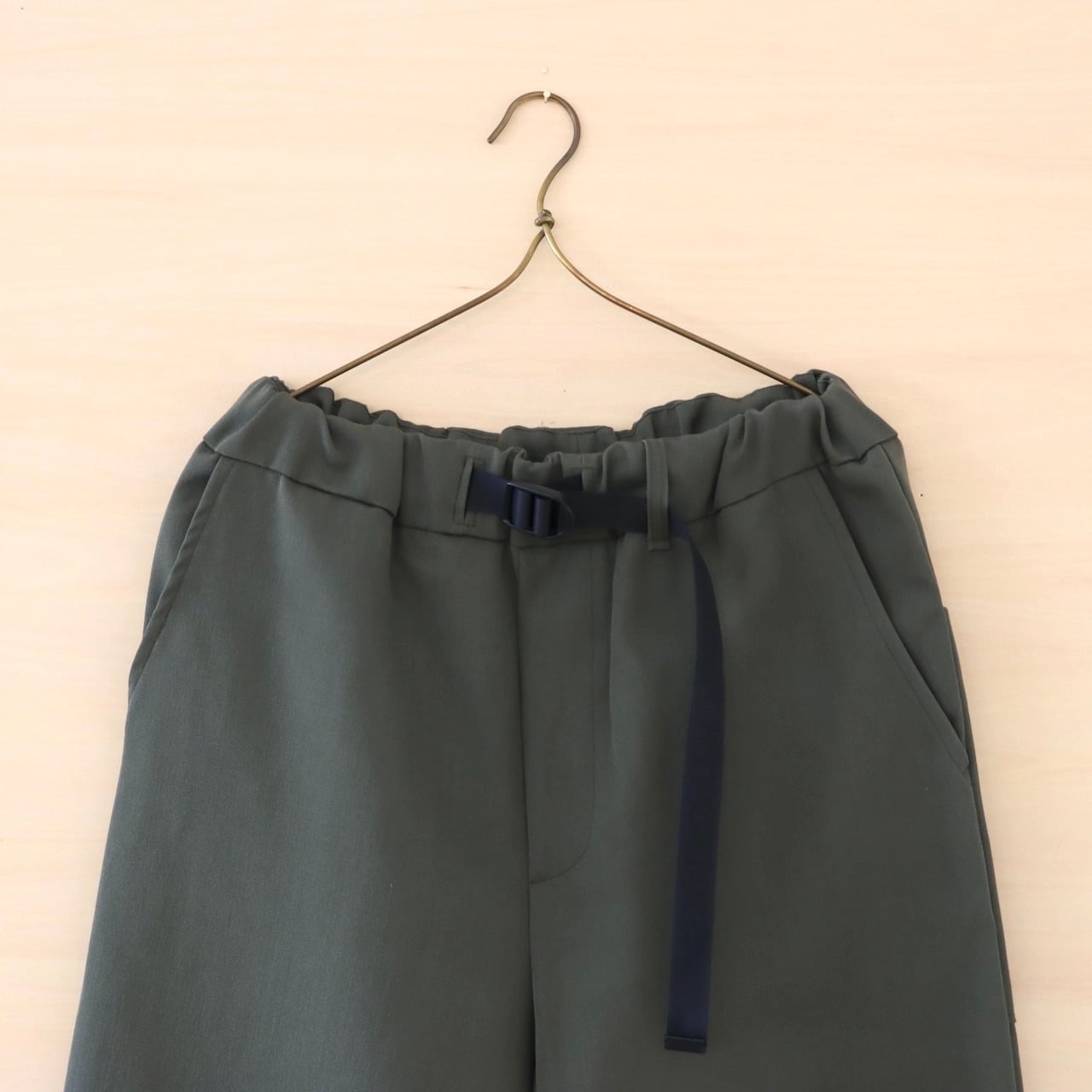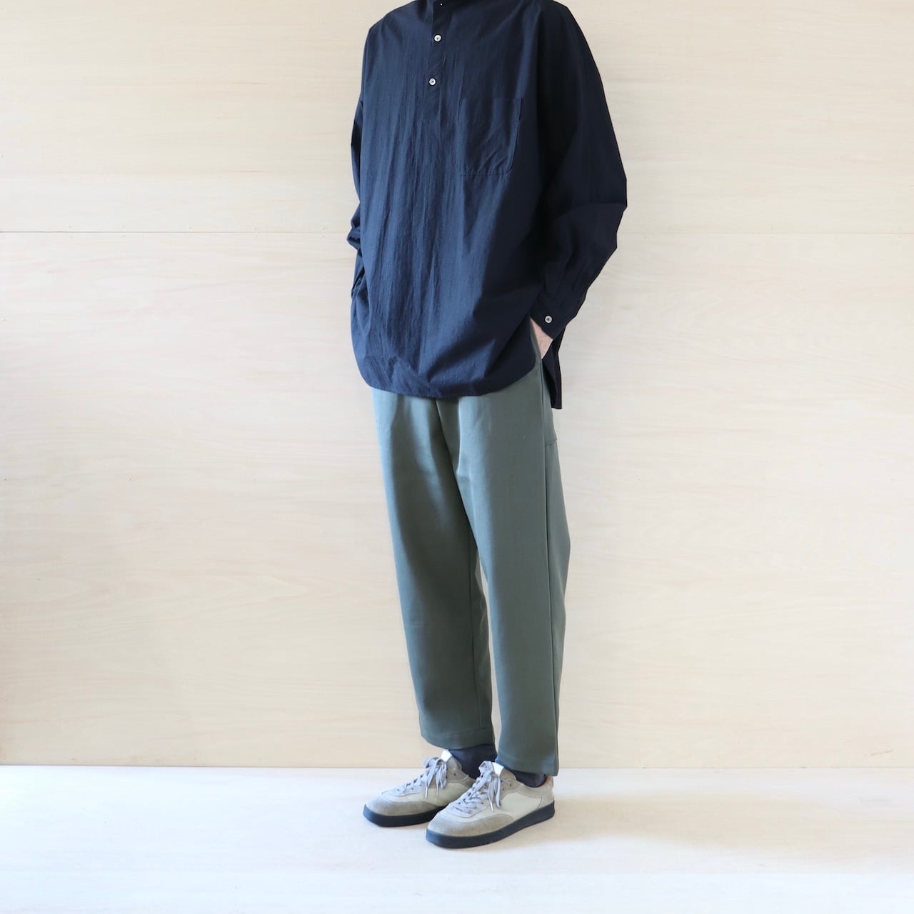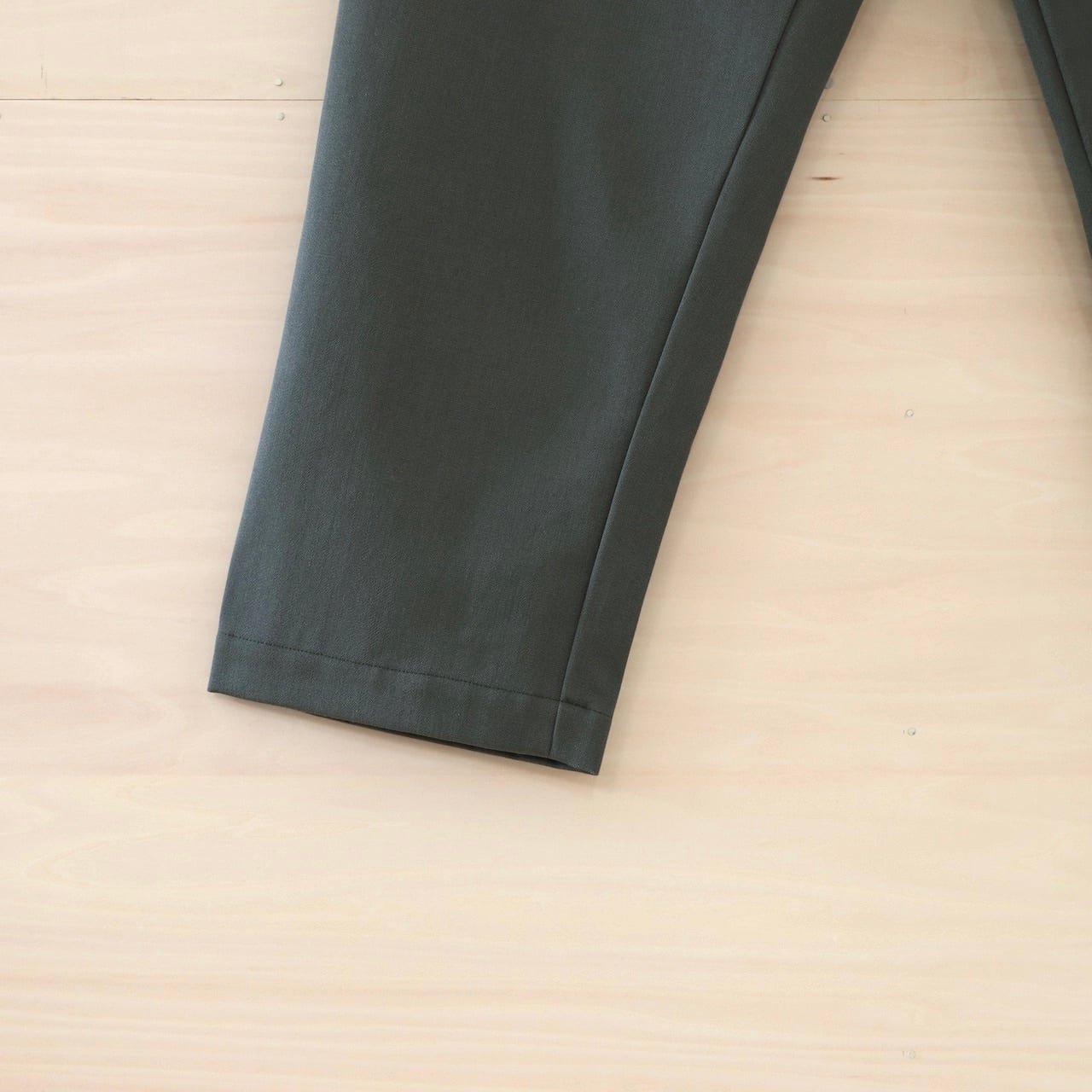 ドスキンウール生地を使用したシロ.定番のアンクルパンツ。雌鹿の皮に似せて作られたビロードのような光沢と柔軟性を持つ厚地の織物です。主に秋冬のフォーマルスーツや礼服の生地として用いられおり、シワがつきにくいのも特徴です。細過ぎず、太過ぎずのシルエットで少しテーパードしています。フロントはフェイクフライ、ウエストはゴムとナイロンテープを使いアジャスターで絞る仕様にしています。後ろにつけた大きめのラウンドポケットは、長財布も入る深さで実用性もあり印象的です。※ウールのザラつきがありますので、抵抗のある方はインナータイツの上に穿くことをおすすめします。