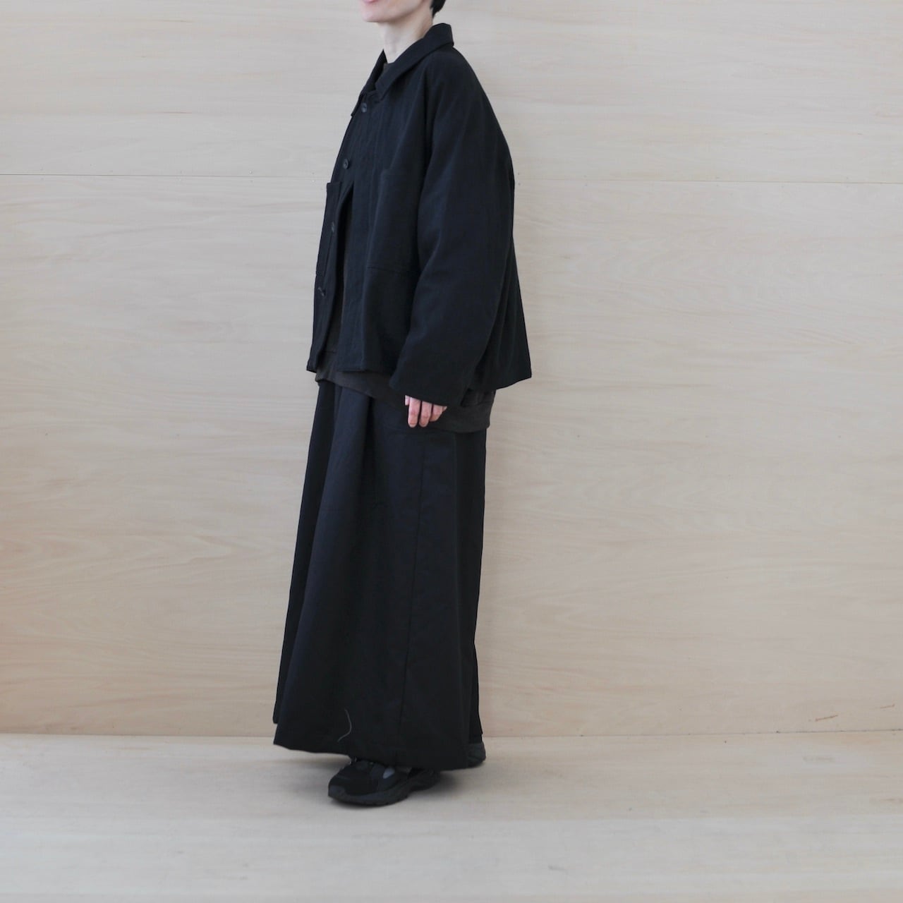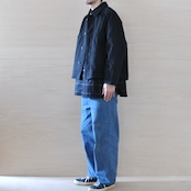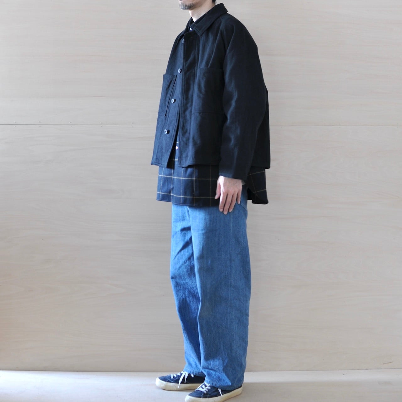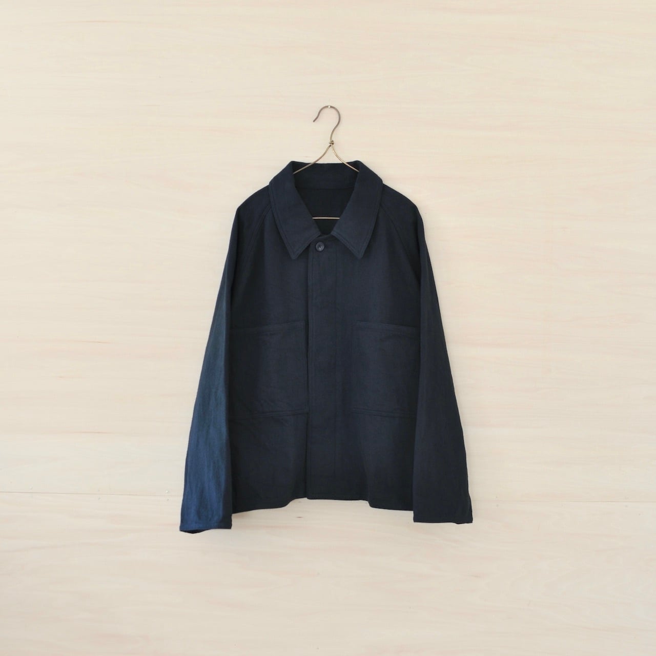 しっかりとした厚みのあるフランネルツイル生地を使用して製作しました。内側は起毛していて、あたたかくて程よい柔らかさもあり着心地がいいです。ステンカラーコートの丈をバッサリと切ったようなイメージとドリズラージャケットのスポーティーな軽快さを表現して製作しました。両胸に大きなポケットを付け、袖口は飾りを付けず、シャツのように折り返して着て頂いても雰囲気がいいです。男女兼用になります。洗濯の際、フランネル生地は脱水をかけすぎてしまうとフェルト化する恐れがありますので30秒〜1分以内の脱水をおすすめします。