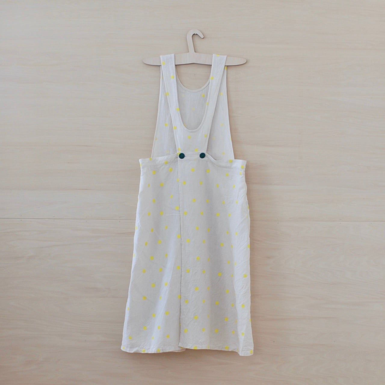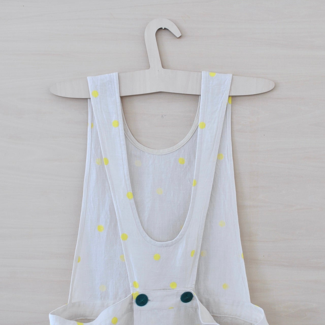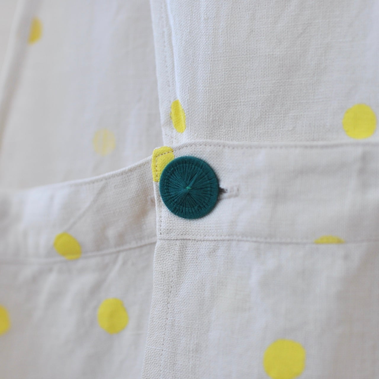 エプロンの身頃とスカート部分をつなぐボタンには、直径23ミリのチェコ製糸ボタンをあしらっています(ボタンはグリーンとオフホワイトタイプがございます)。