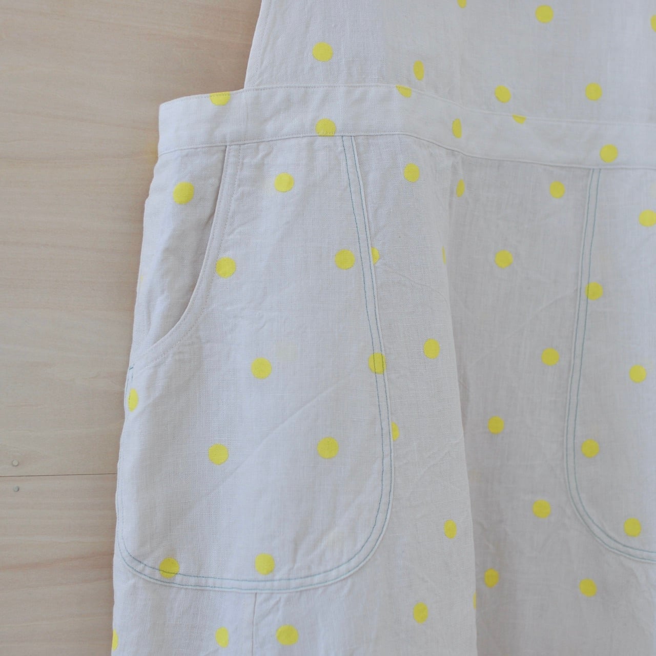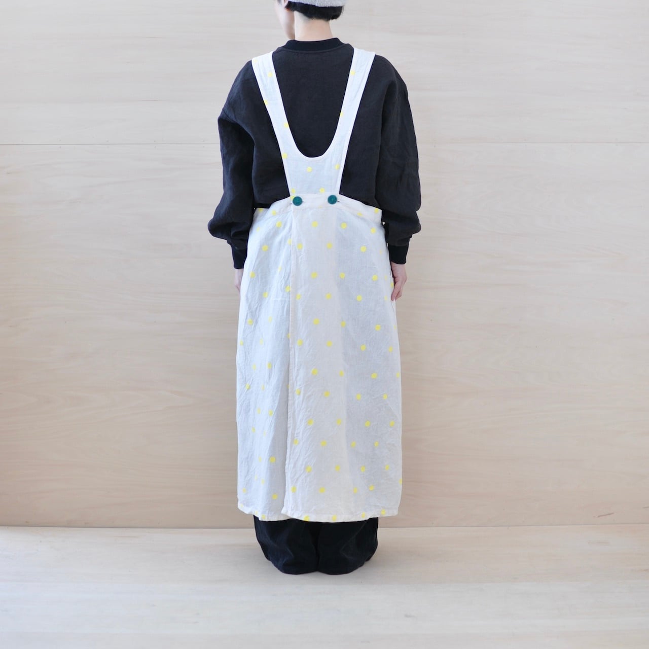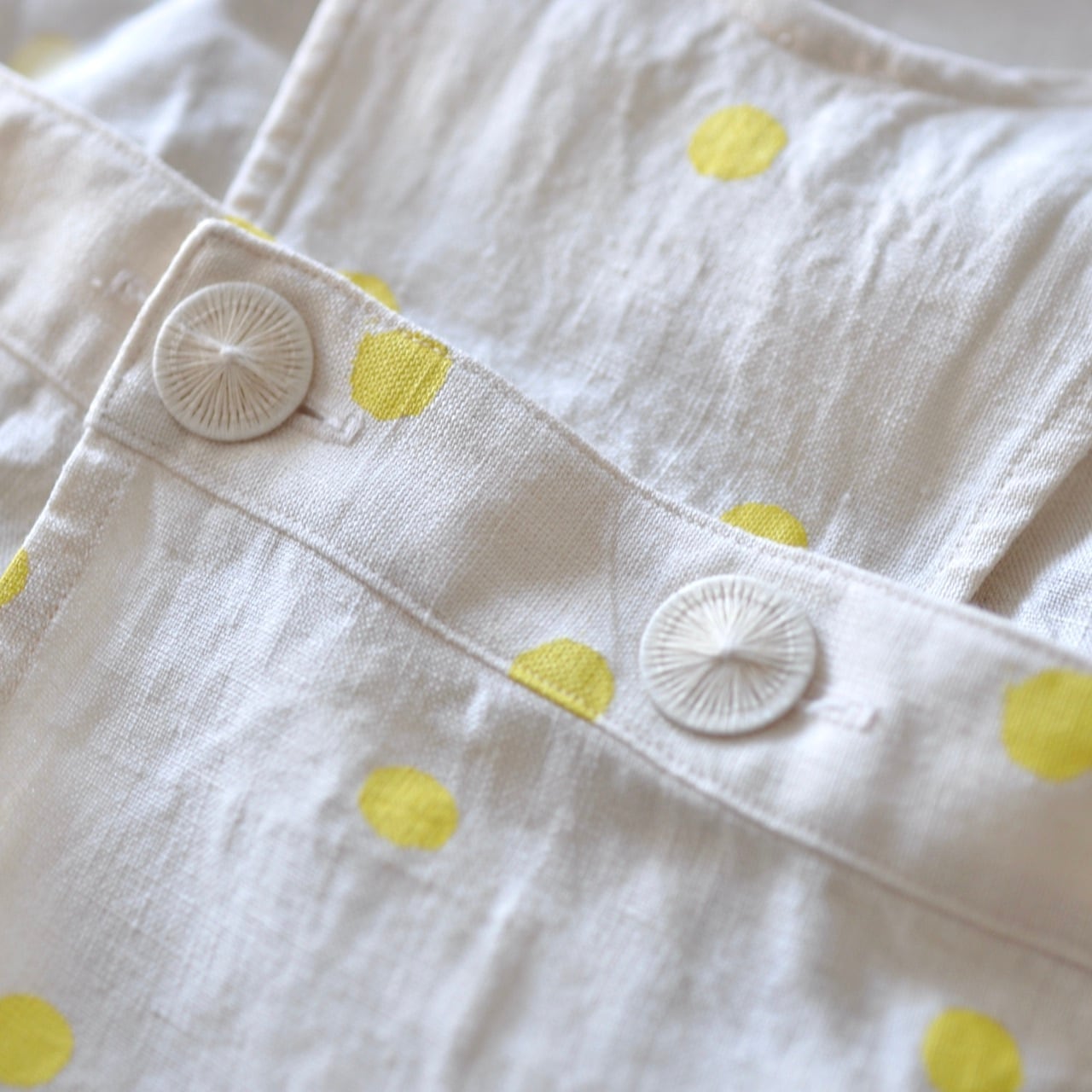 エプロンの身頃とスカート部分をつなぐボタンには、直径23ミリのチェコ製糸ボタンをあしらっています(ボタンはグリーンとオフホワイトタイプがございます)。
