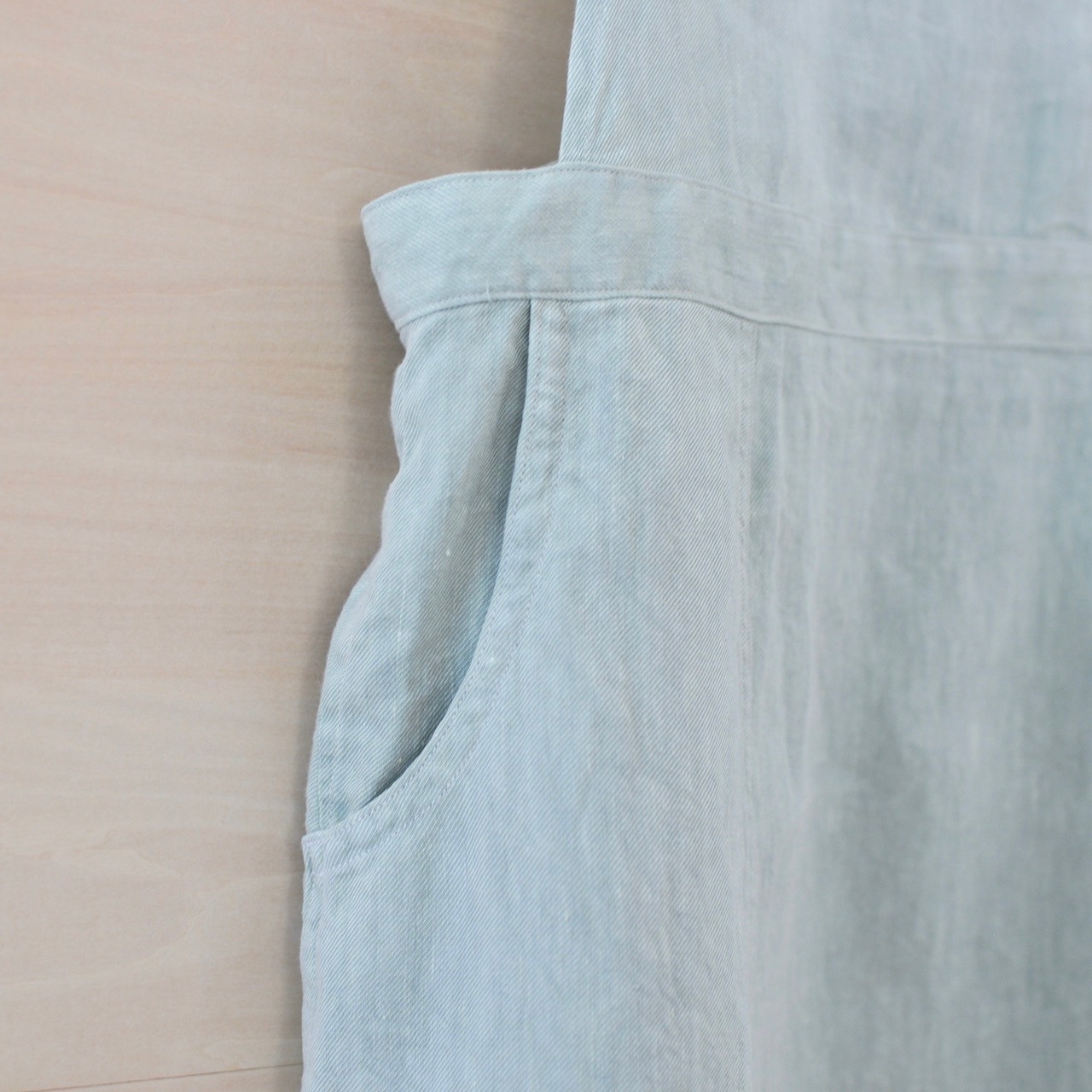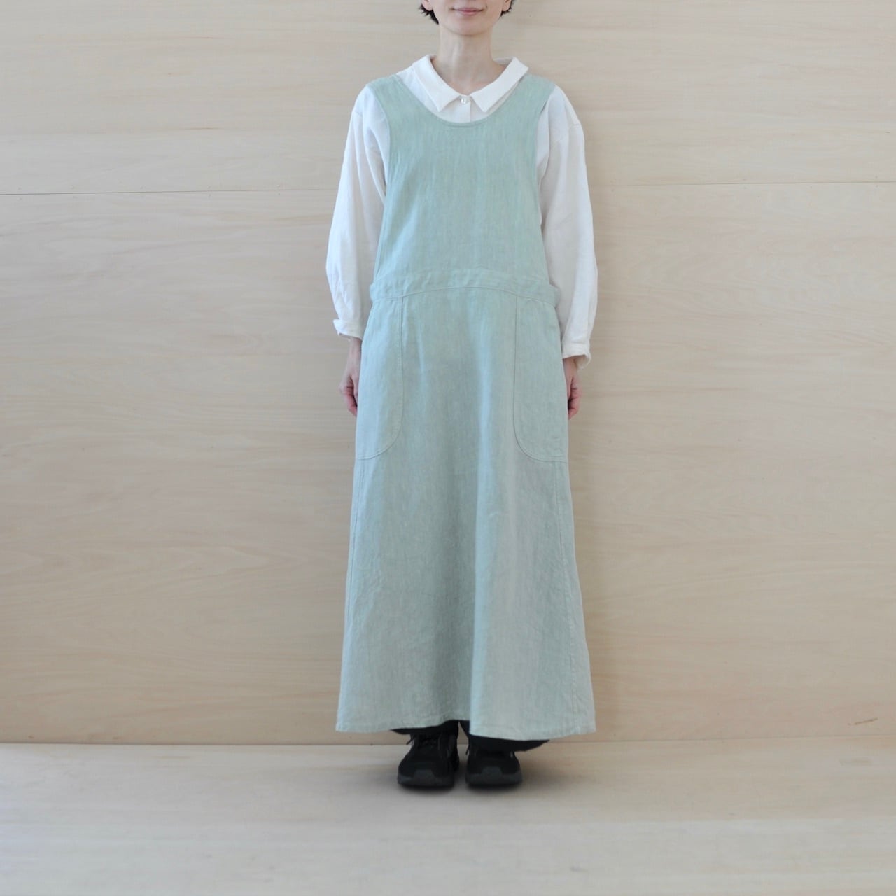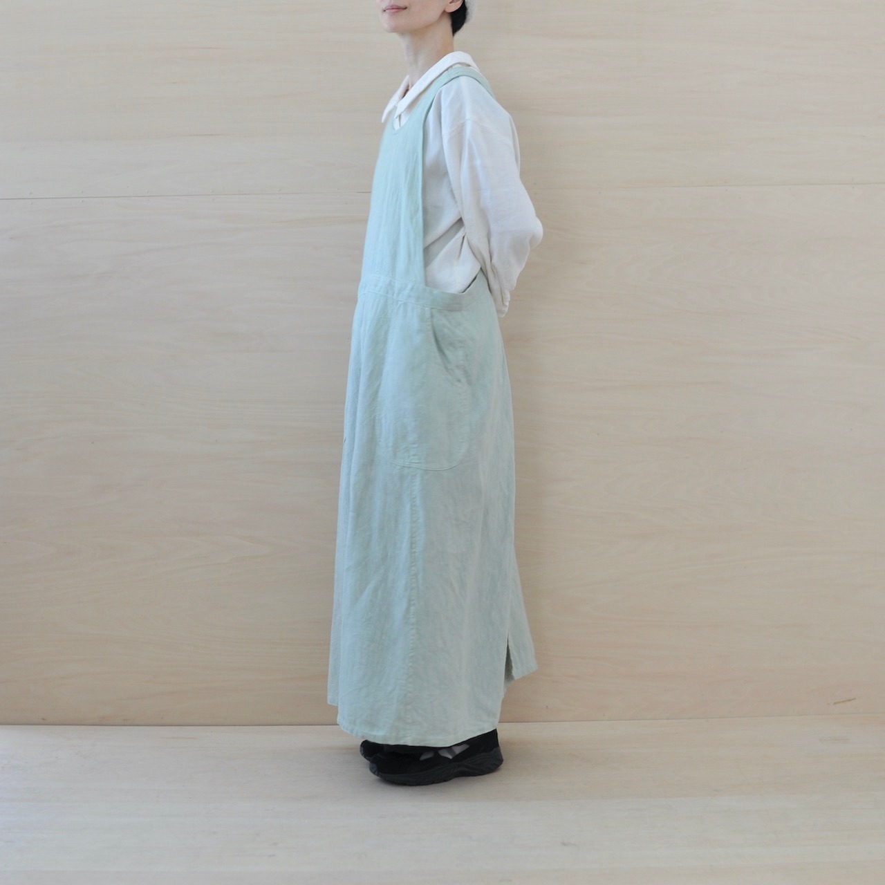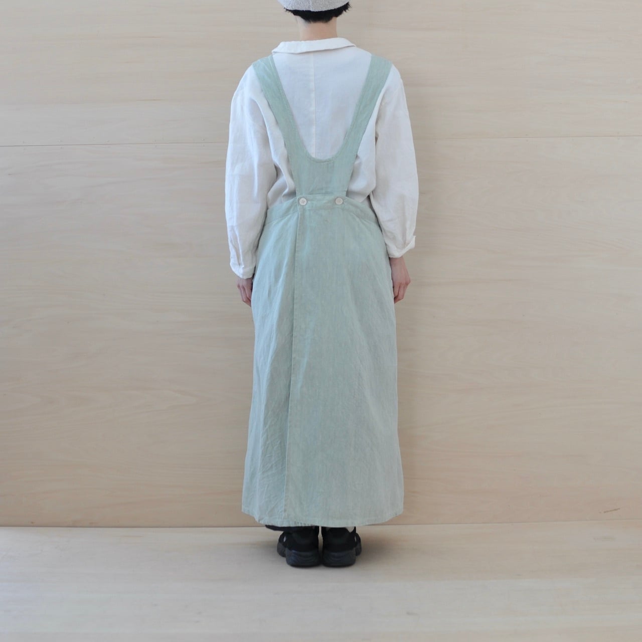 チェコ軍のメディカルエプロンをベースに作ったエプロンです。チェコの多くの女性が使用したことを想像し、チェコの女性の代表的な名前の一つ「hana」をこのエプロンに名付けました。ミリタリーの良いところは機能性から生まれるラインの美しさ。随所に工夫がちりばめられています。いいところはそのままに、新たにパターンをつくりました。(デットストックを調べていくと、サイズは大小様々あり、チェコの女性はかなり大柄な方がいたことを連想させてくれます。)あえてオーバーサイズでつくり、ワンピースのようにゆったりと着られるようになっています。また、重ね着しても楽しめそうです。ウエストの左右にはボタンホールが2つずつあり、肩紐部分についているボタンに留める仕様となっています。