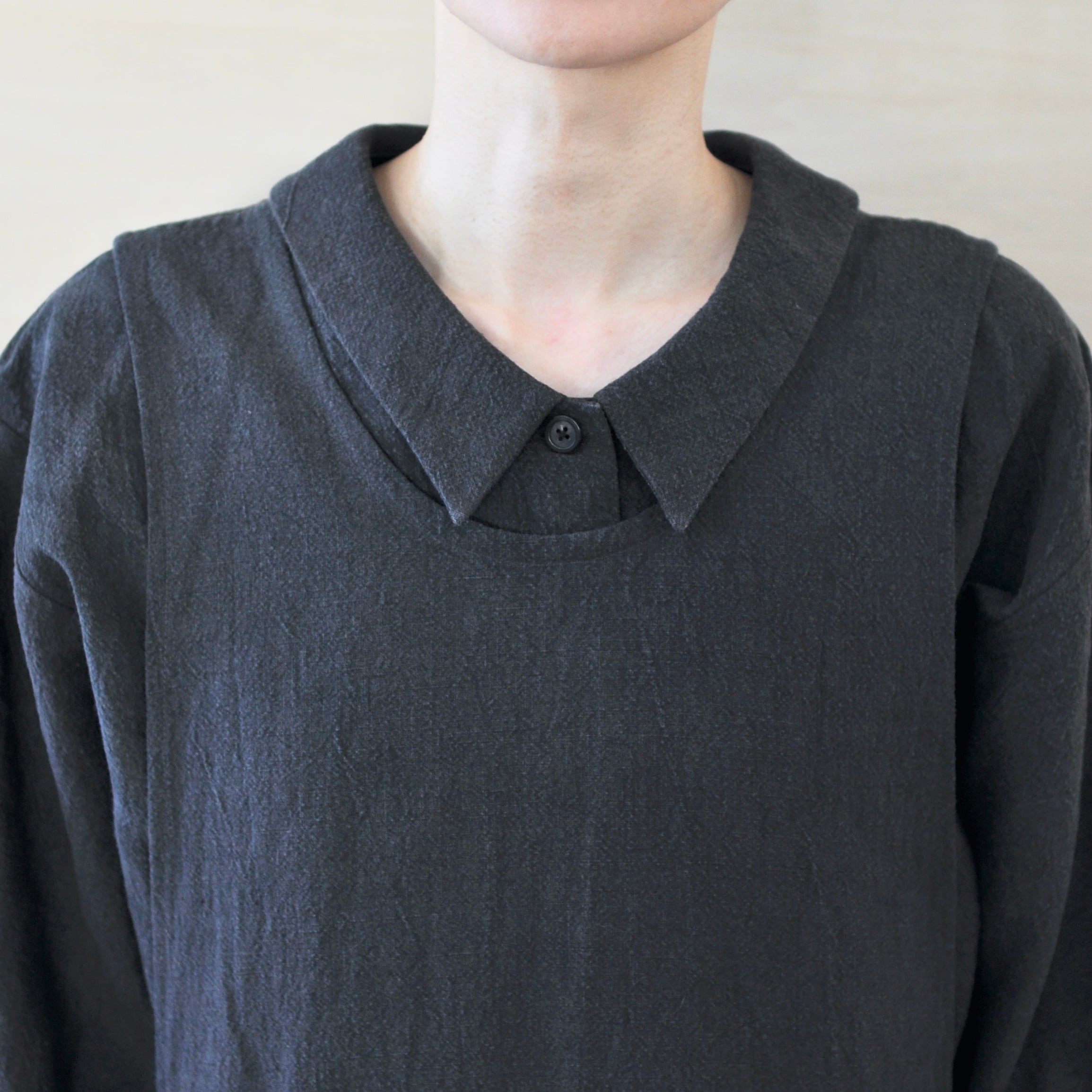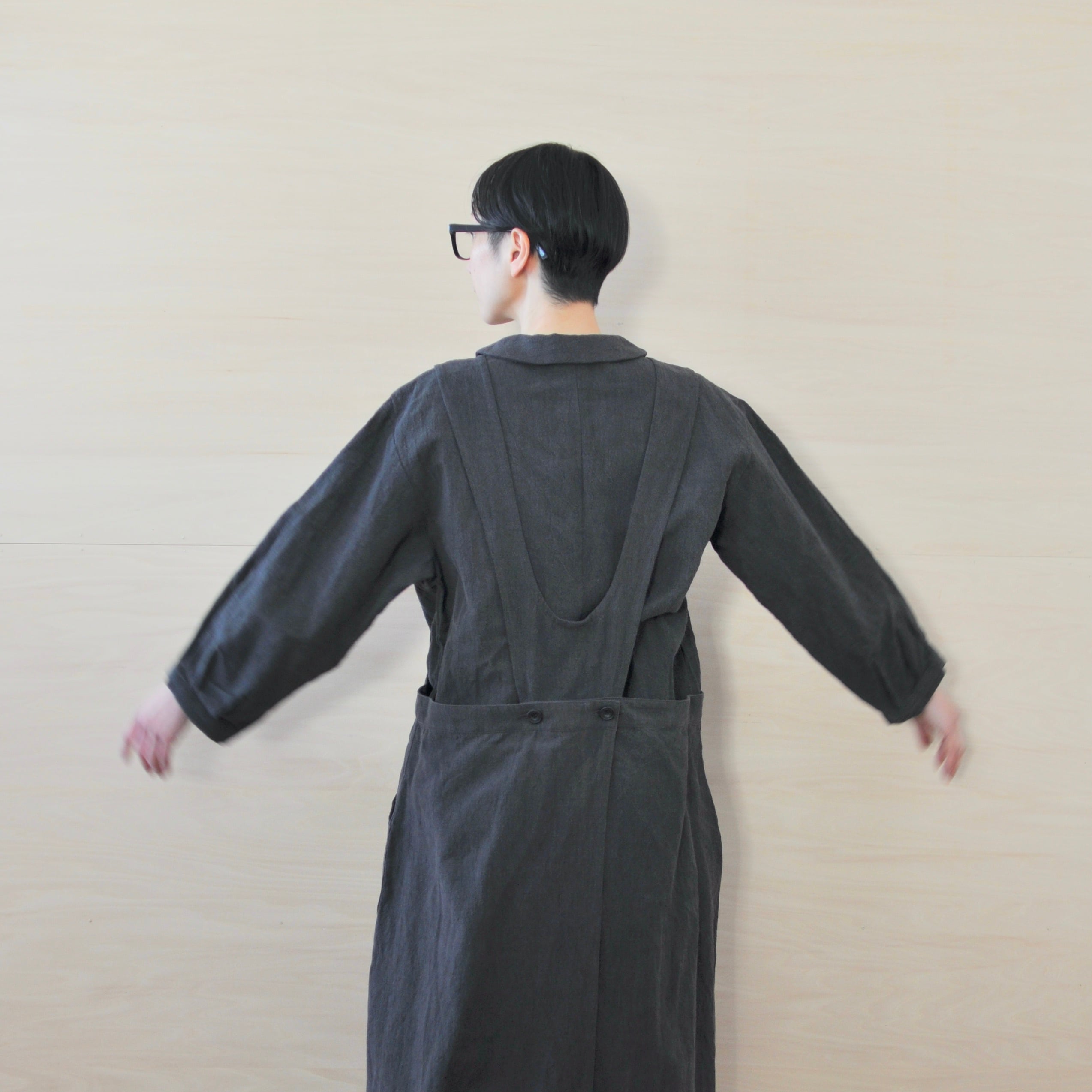 チェコ軍のメディカルエプロンをベースに首元のラインやサイズ感、背後のデザインなど、毎度パターンを見直して製作しているhanaエプロン。紀州備長炭染めの生地表面に凹凸のあるコットンリネン生地を使用して製作しました。小さな窯で染め上げることで独特なカミナリシワが生まれヴィンテージ感のある風合いとなっています。