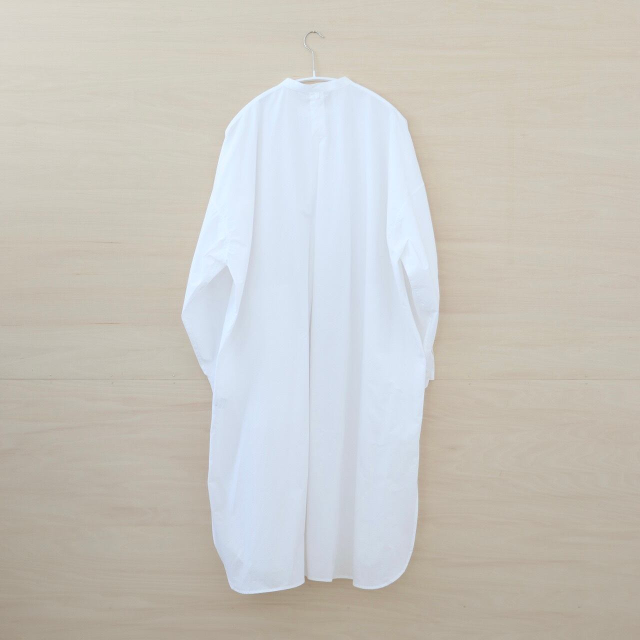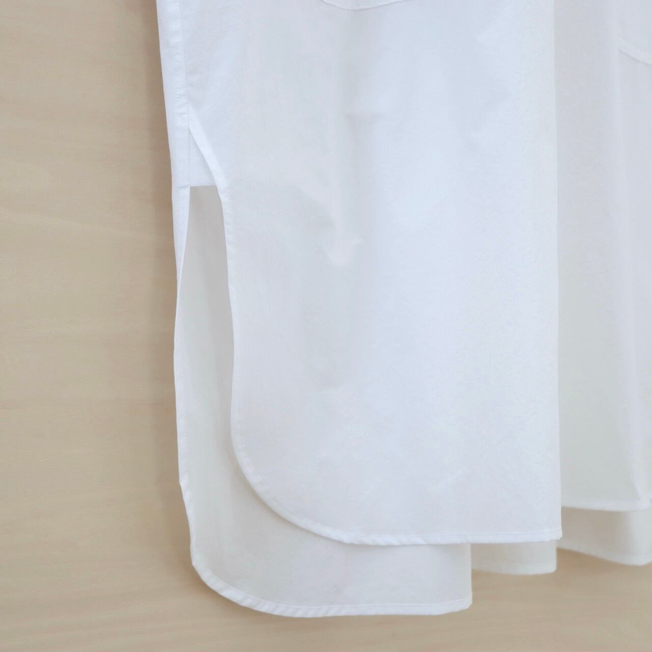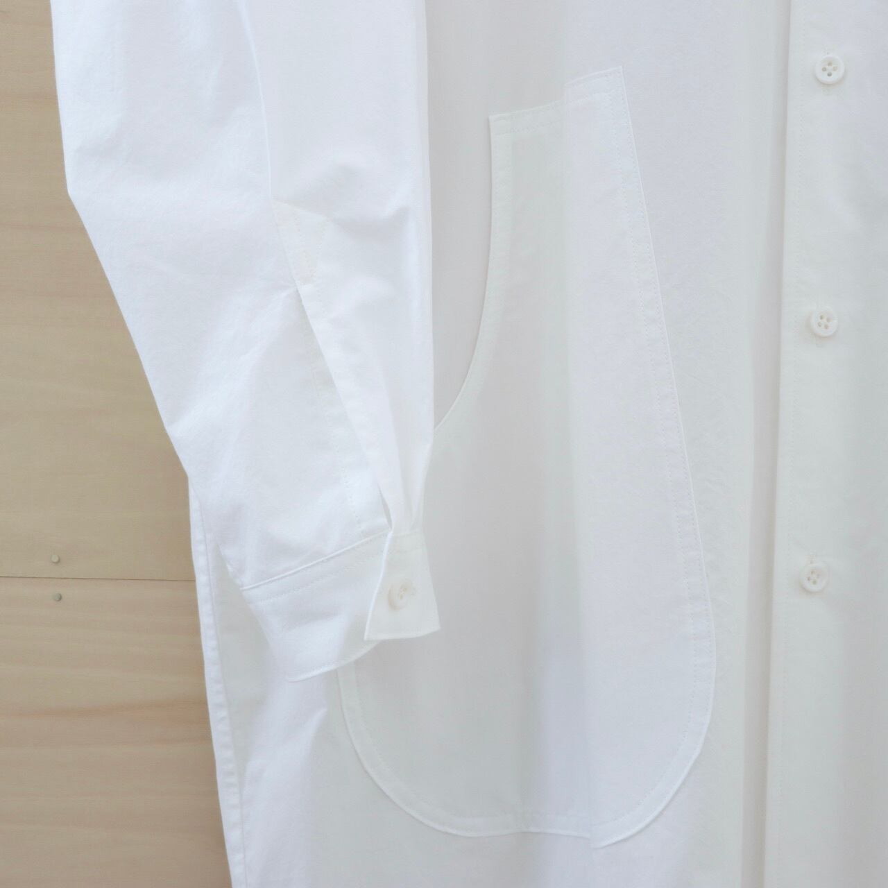 コンパクト糸で織られたタイプライター生地を使用。程よい反発感と柔らかさを兼ね備え、シルエットの保持と着心地の良さを両立させたハイクオリティーな生地です。シロ.の定番であるオーバーサイズロングシャツをベースに、hanaエプロンのポケットをつけてシンプルでも印象的なロングシャツとなっています。縫製後、製品洗いを一度かけておりますので極端な縮みはございません。洗濯はボタンを閉じて、手洗いまたネット洗いをお願い致します。脱水はかけ過ぎずに、ハンガー干をして水の重さでシワを伸ばすと良いです。