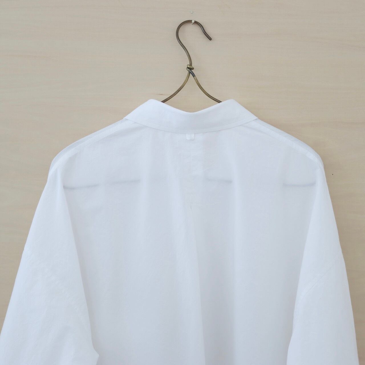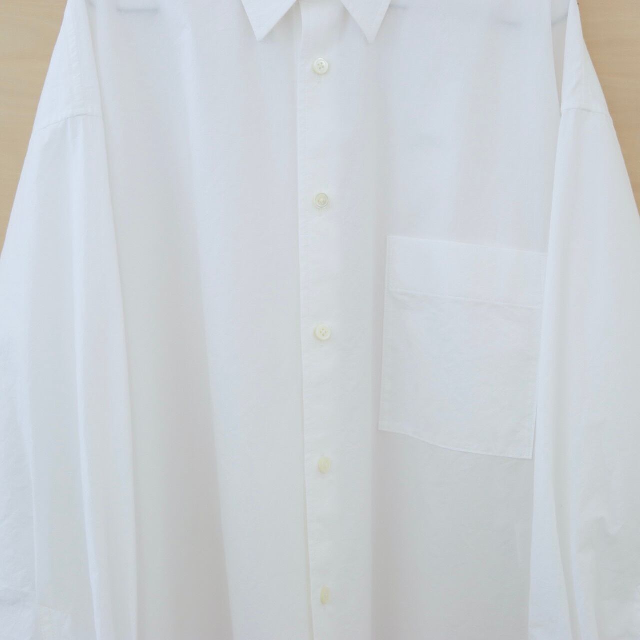 コンパクト糸で織られたタイプライター生地を使用。程よい反発感と柔らかさを兼ね備え、シルエットの保持と着心地の良さを両立させたハイクオリティーな生地です。シロ.の Regular collar Oversized Shirt は70'Sスウェーデン、60'Sアメリカのシャツなどのパターンを見直し組み合わせたシロ. の名刺代わりのようなシャツです。時間をかけておこしたパターンは、襟の大きさや、カフスの収まり、ガゼットの大きさなど細部にも拘りました。縫製後、製品洗いを一度かけておりますので極端な縮みはございません。洗濯はボタンを閉じて、手洗いまたネット洗いをお願い致します。脱水はかけ過ぎずに、ハンガー干をして水の重さでシワを伸ばすと良いです。