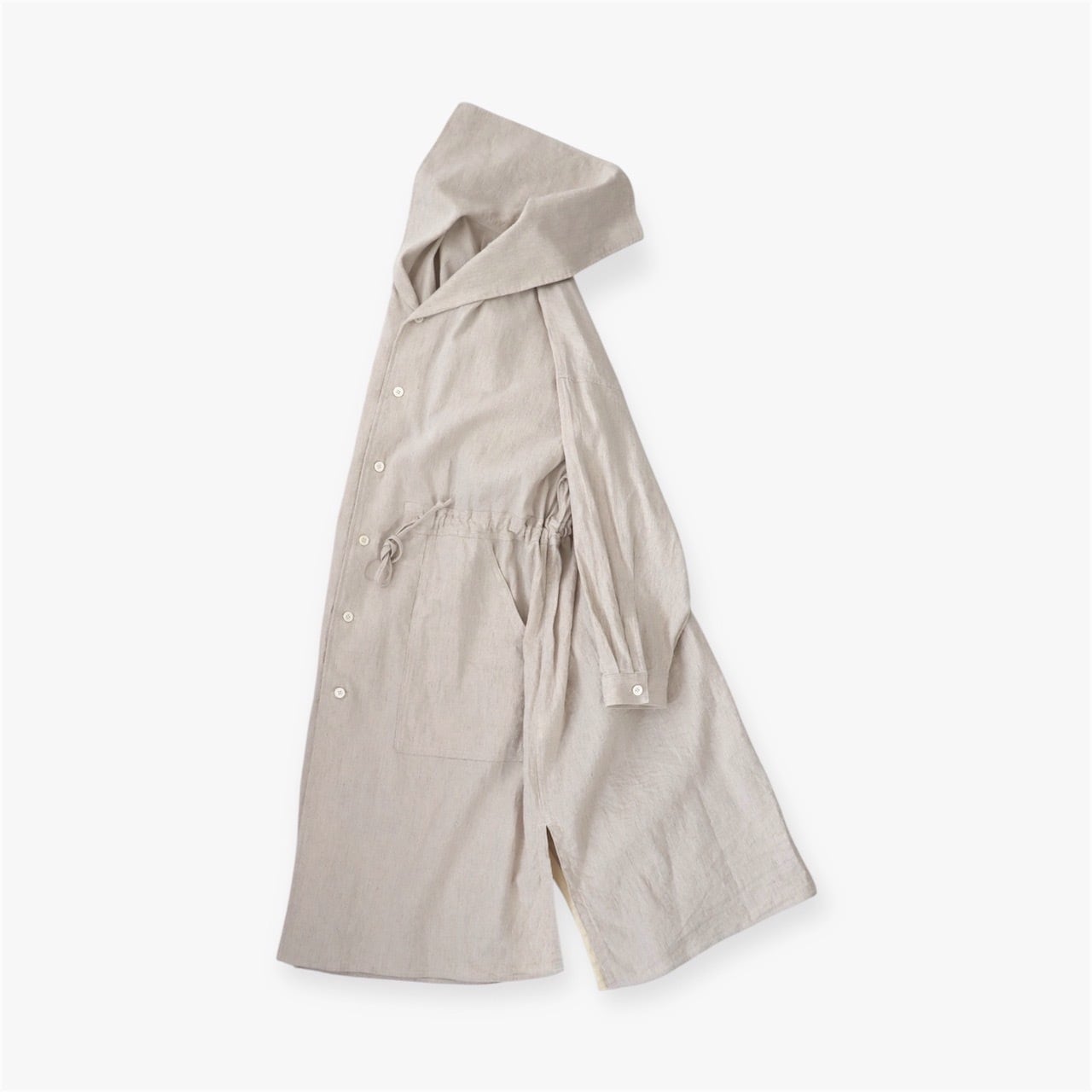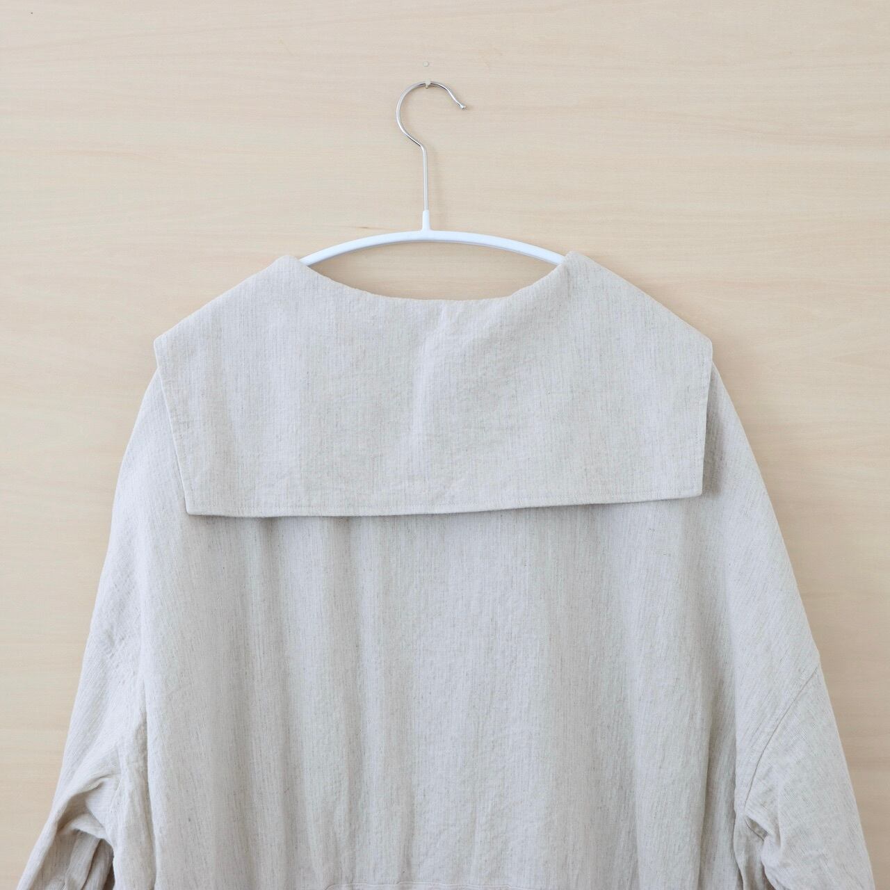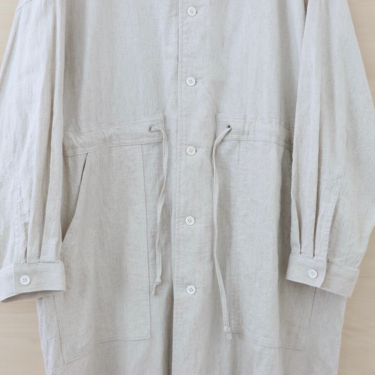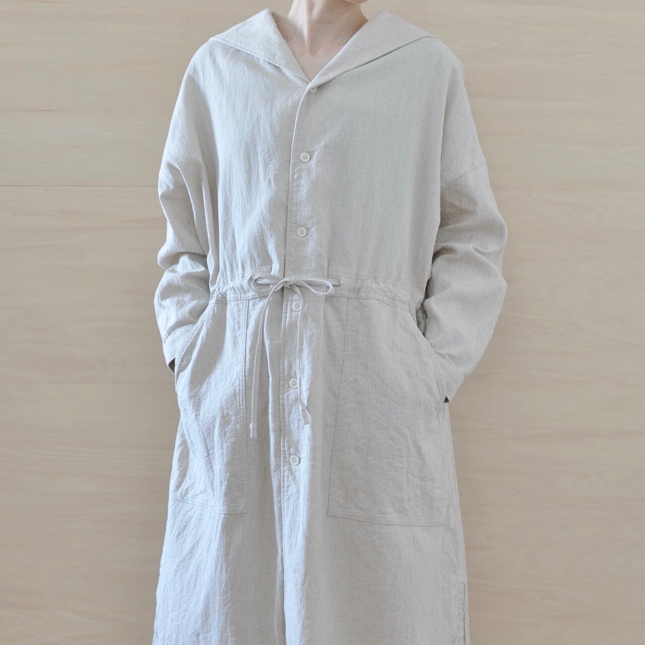 群馬県の伝統的な技術と知識で織り染められた綿麻生地で久しぶりにセーラーカラーロングシャツを製作しました。ヴィンテージ感のある変り織は着物のようなどこか懐かしい雰囲気のある表情が特徴です。軽さと通気性に優れ、シャツ感覚でさっと羽織れる扱いやすい素材です。洗い込んで少しシワがあるくらいがかっこいい気がします。シロ. の定番であるオーバーサイズロングシャツをベースにゆったりとしたサイズ感となっています。こちらのセーラーは腰あたりにコードを付け、シルエット調整ができコーディネートの幅が広がると思います。ファティーグパンツのような大きめのポケットを付け手を入れやすく。サイドスリットを入れ上品さも意識しました。