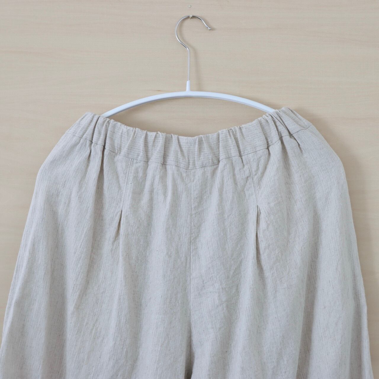 群馬県の伝統的な技術と知識で織り染められた綿麻生地でhakamaパンツを製作しました。ヴィンテージ感のある変り織は着物のようなどこか懐かしい雰囲気のある表情が特徴です。軽さと通気性に優れ、シャツ感覚でさっと羽織れる扱いやすい素材です。洗い込んで少しシワがあるくらいがかっこいい気がします。生地巾をたっぷり使いボリュームがある為、前後にはタックを入れ、ポケットはすっきりとした印象にしたかったので、シームポケット仕様にしています。