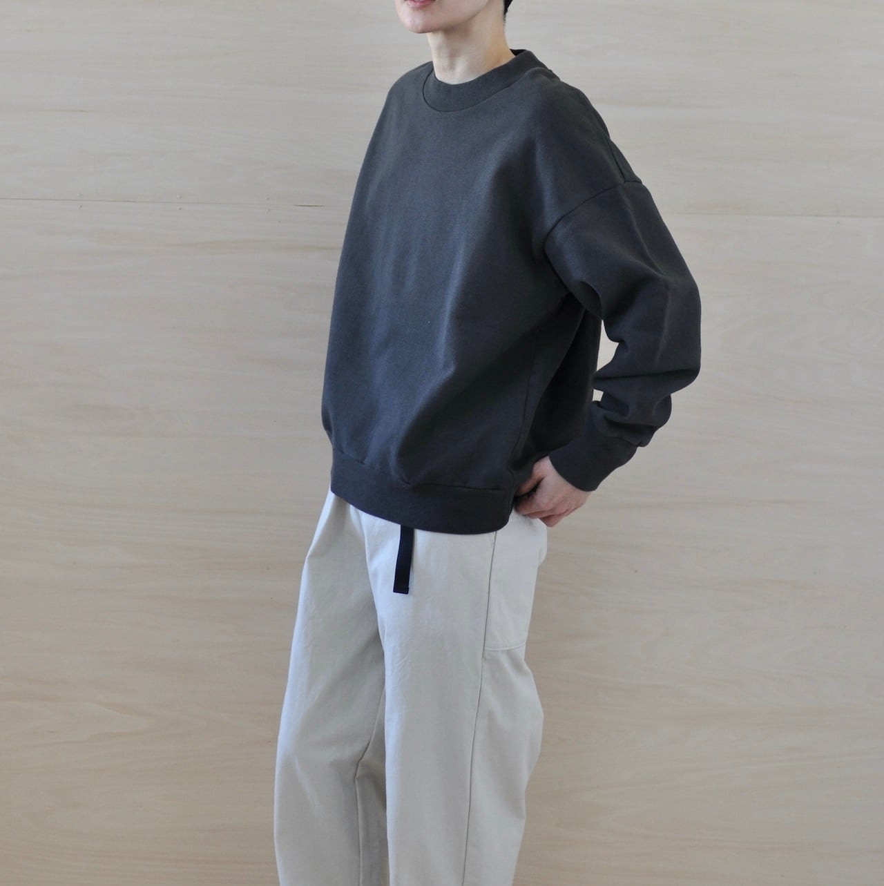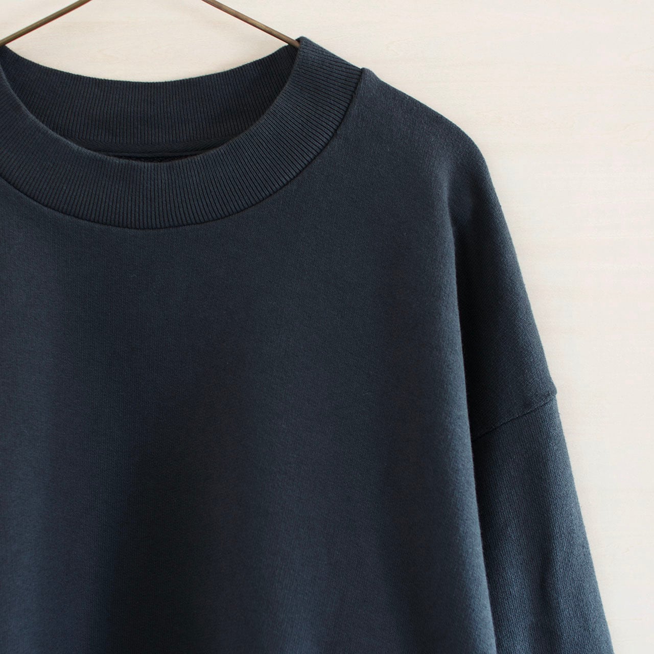 程よい厚みのヴィンテージ裏毛スウェット生地を使用して作りました。生機の状態で縫製し製品染めを施しました。特殊な加工により古着のような白っぽくあたりのある風合いに仕上げています。経年変化を考えて、イメージしている色よりもワントーン低く染めています。着込み洗いをかけて育ててほしいスウエットです。シルエットはゆったりとさせアームホールを大きくとりました。首まわりはやや狭めにしています。リブ袖は袖口にかけて狭くなるように角度をつけて70年代頃にあった軍物のようなシンプルでも印象的なスウェットに仕上げました。