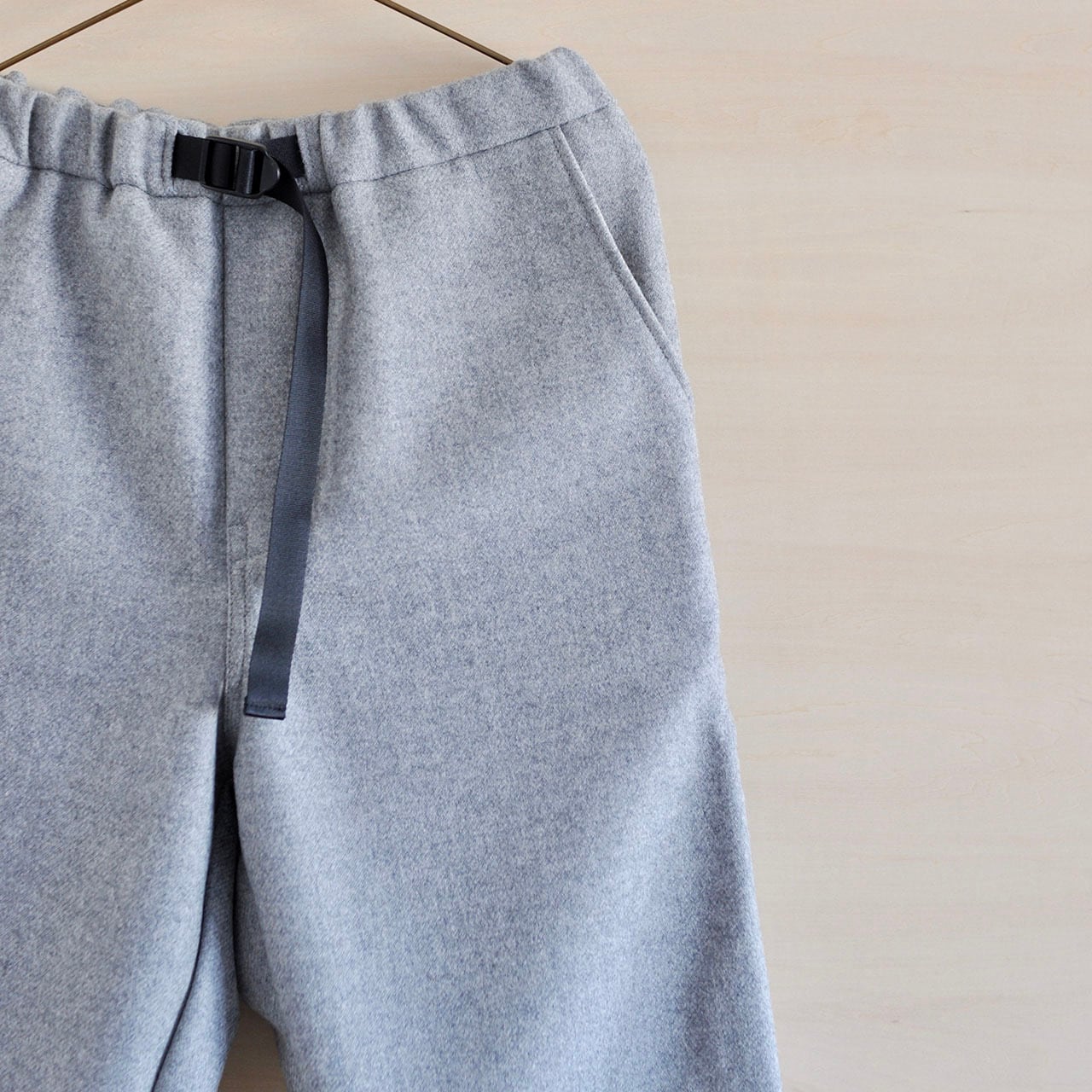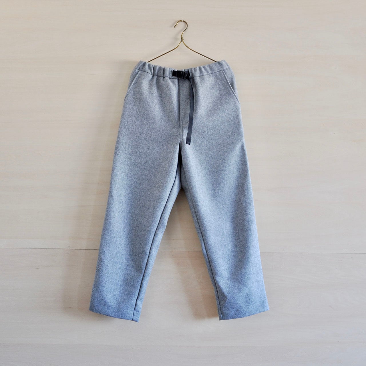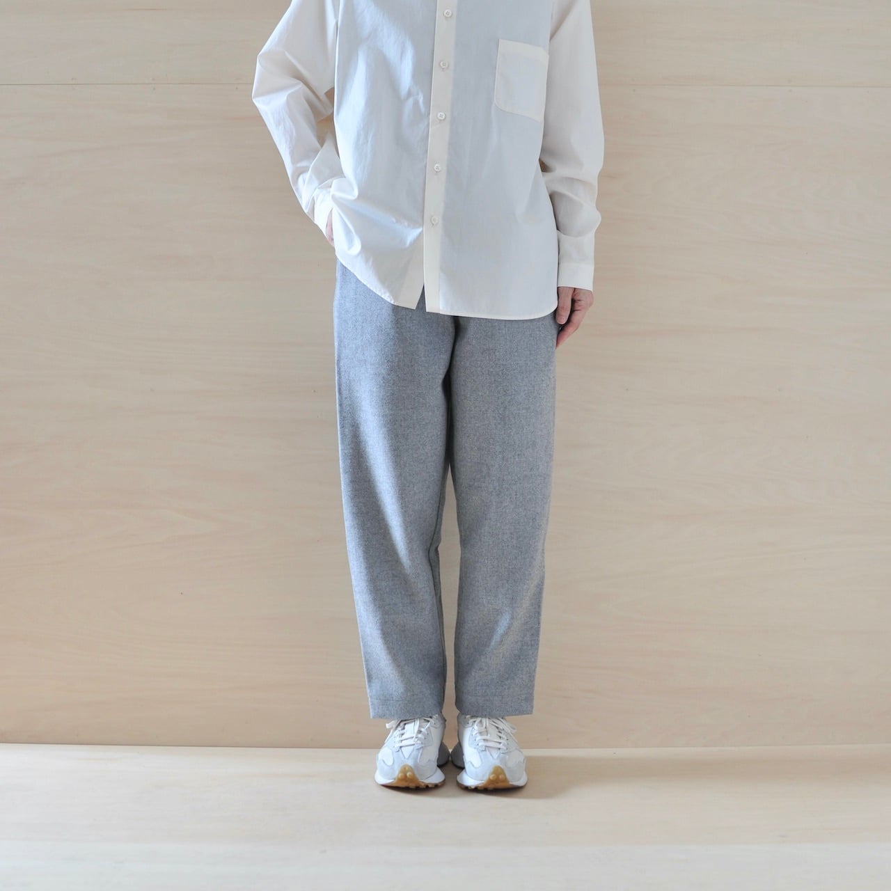 カシミアのような軽く柔らかいスーパーウール生地で作りました。ウブ毛のような肌触りは品質の良さが分かります。同素材でジャケットも作りましたのでセットアップとしても合わせて頂けます。シロ.で形を変えずに作り続けているアンクルパンツ。ベースは70'Sスウェーデン軍のパンツのシルエットを活かしてパターンを引き、自分なりに手を加えて作っています。細過ぎず、太過ぎずのシルエットで少しテーパードしています。フロントはフェイクフライ、ウエストはゴムとナイロンテープを使いアジャスターで絞る仕様にしています。後ろにつけた大きめのラウンドポケットは、長財布も入る深さで実用性もあり印象的です。