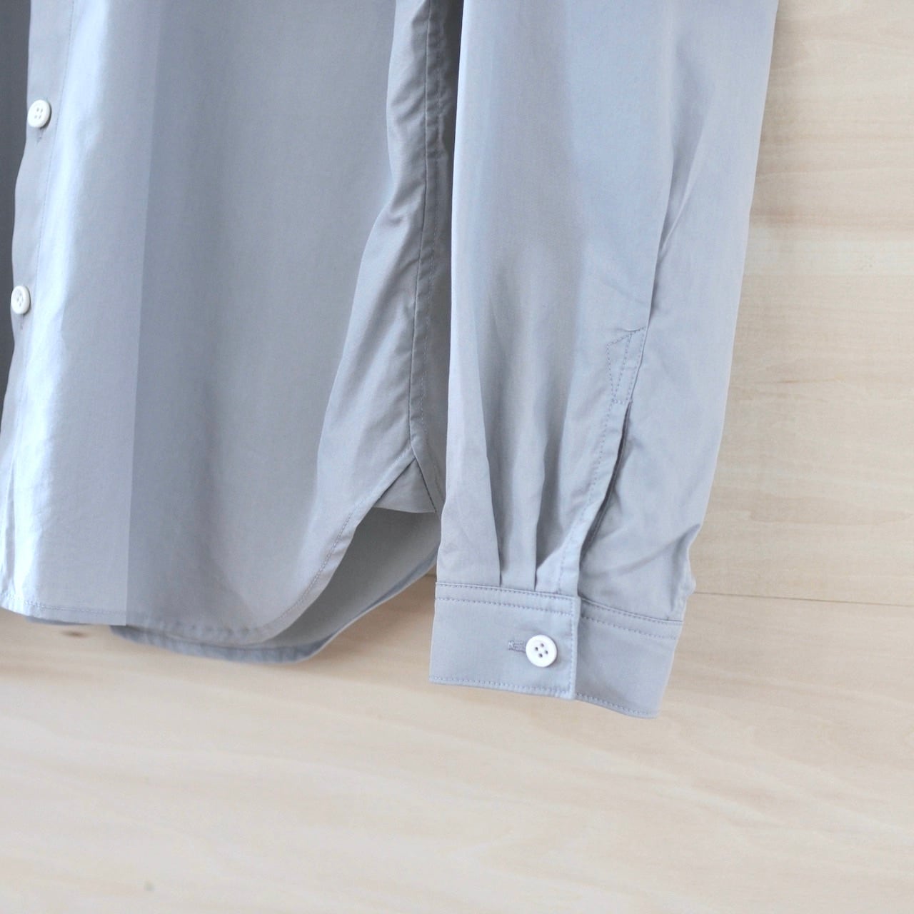 シロ.のレギュラーカラーベーシックシャツ。程よい光沢としなやかで肌触りのいい上品なブロード生地を使用して製作しました。このシャツは70'Sスウェーデン、60'Sアメリカのシャツなどを参考に、気に入ったディテールやシルエットラインを活かし時間をかけてパターンをおこしました。2015年7月に発表してから形を変えずに製作し続けているシロ. の名刺代わりのようなシャツです。大きすぎないサイズ感でアームホールも細めなので、重ね着したい時やアウターを羽織る時にゴワつかないのもいい点です。一度製品洗いを施しておりますので極端な縮みはございません。