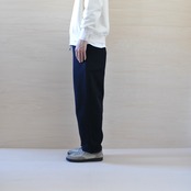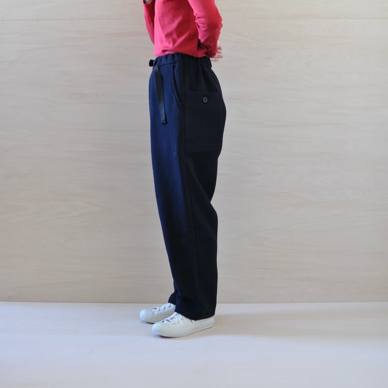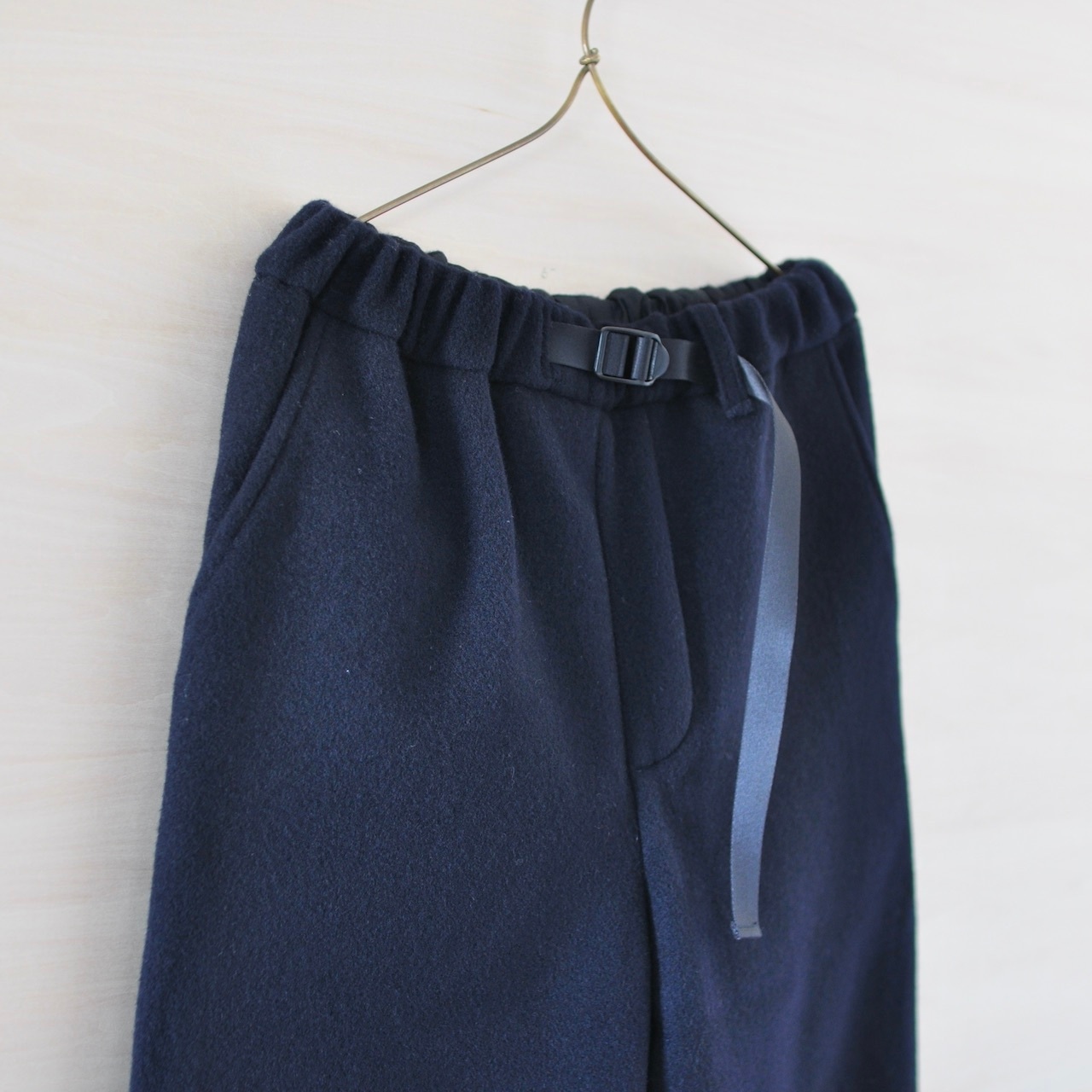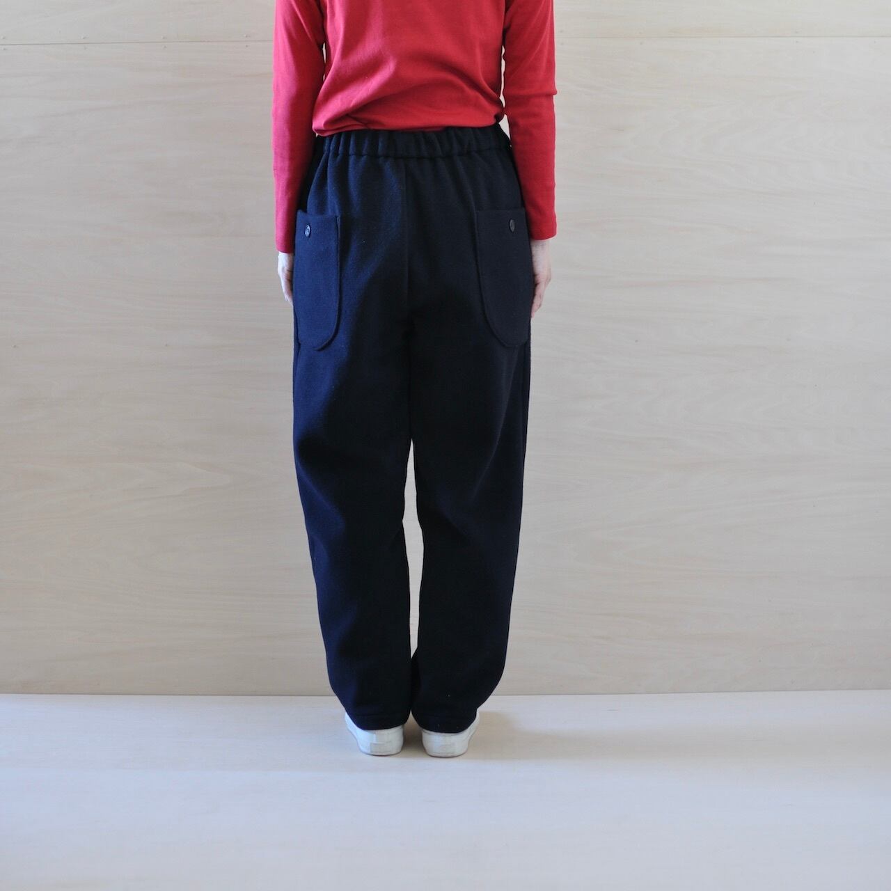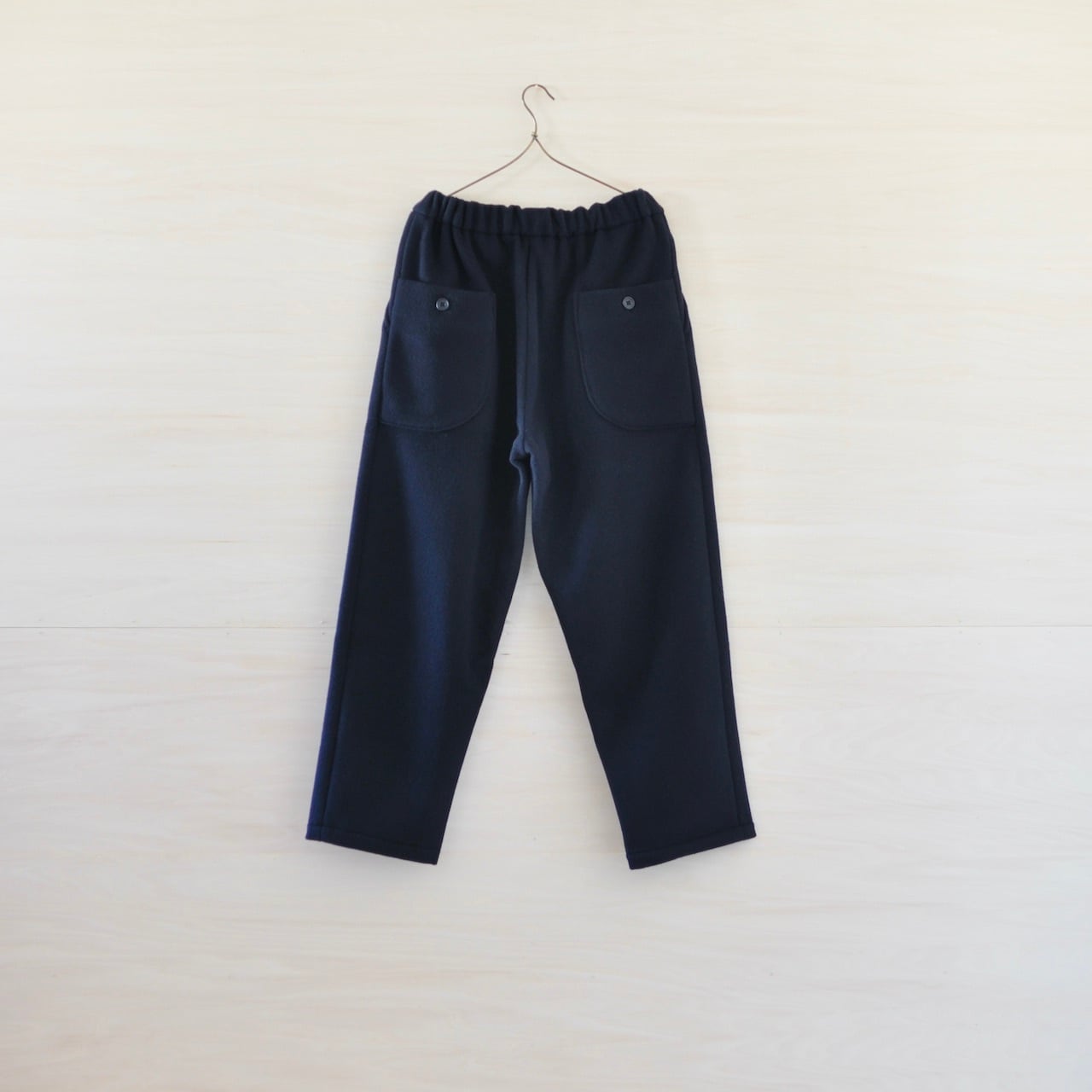 縮絨加工を施し起毛させた毛羽を短く刈りふっくらとした肌触りのいいウールモッサは保温性に優れ軽く柔らかいの生地です。シロ.で形を変えずに作り続けているアンクルパンツを製作しました。ベースは70'Sスウェーデン軍のパンツのシルエットを活かしてパターンを引き、自分なりに手を加えて作っています。細過ぎず、太過ぎずのシルエットで少しテーパードしています。フロントはフェイクフライ、ウエストはゴムとナイロンテープを使いアジャスターで絞る仕様にしています。後ろにつけた大きめのラウンドポケットは、長財布も入る深さで実用性もあり印象的です。男女兼用3サイズです。
