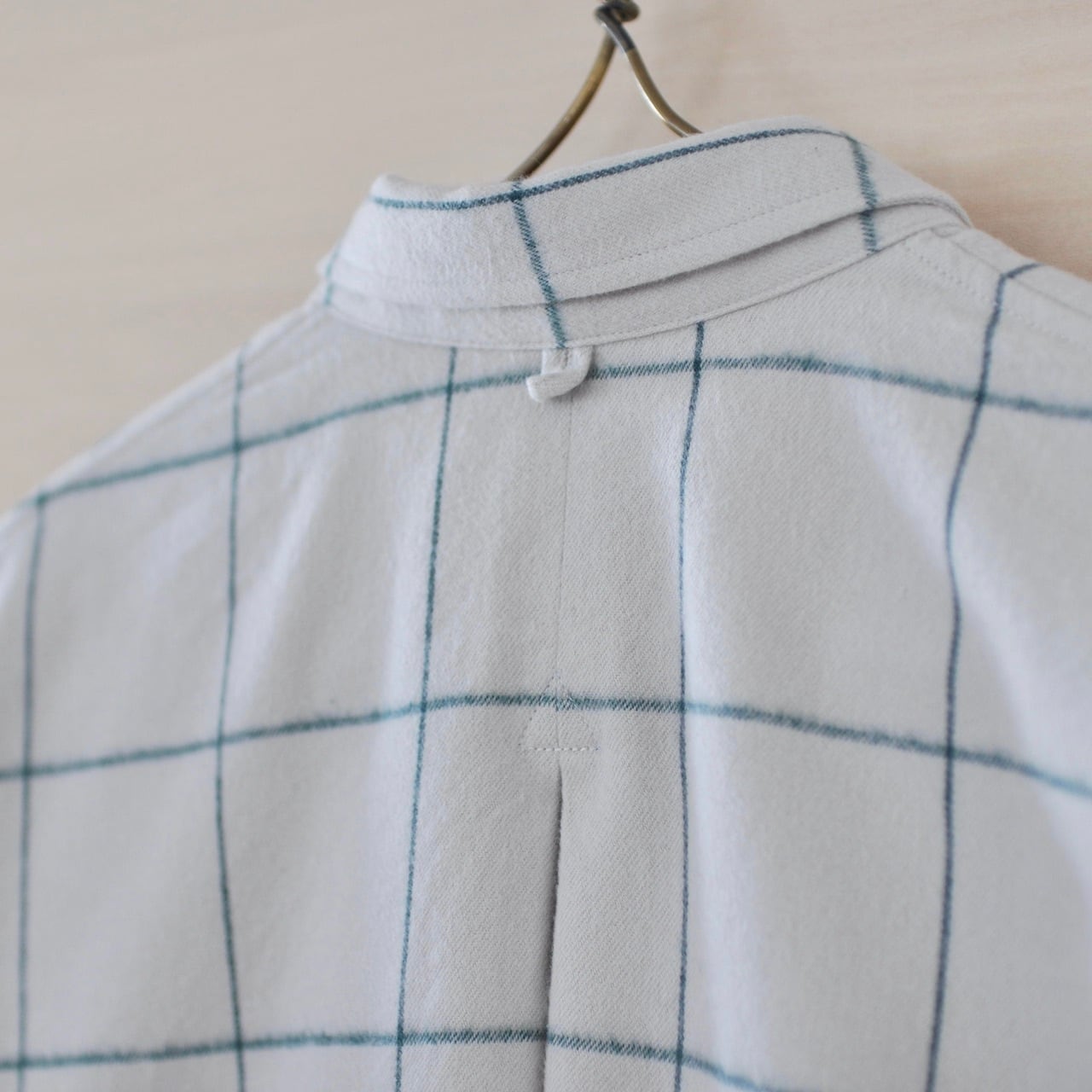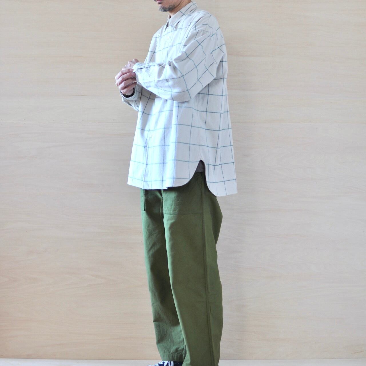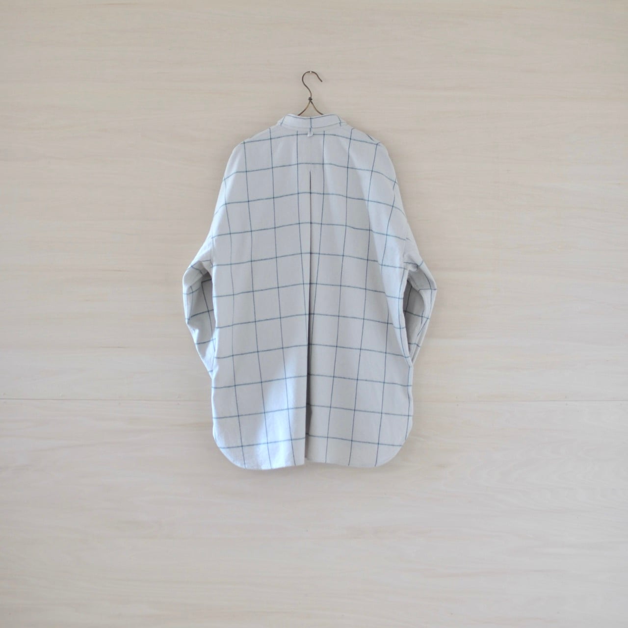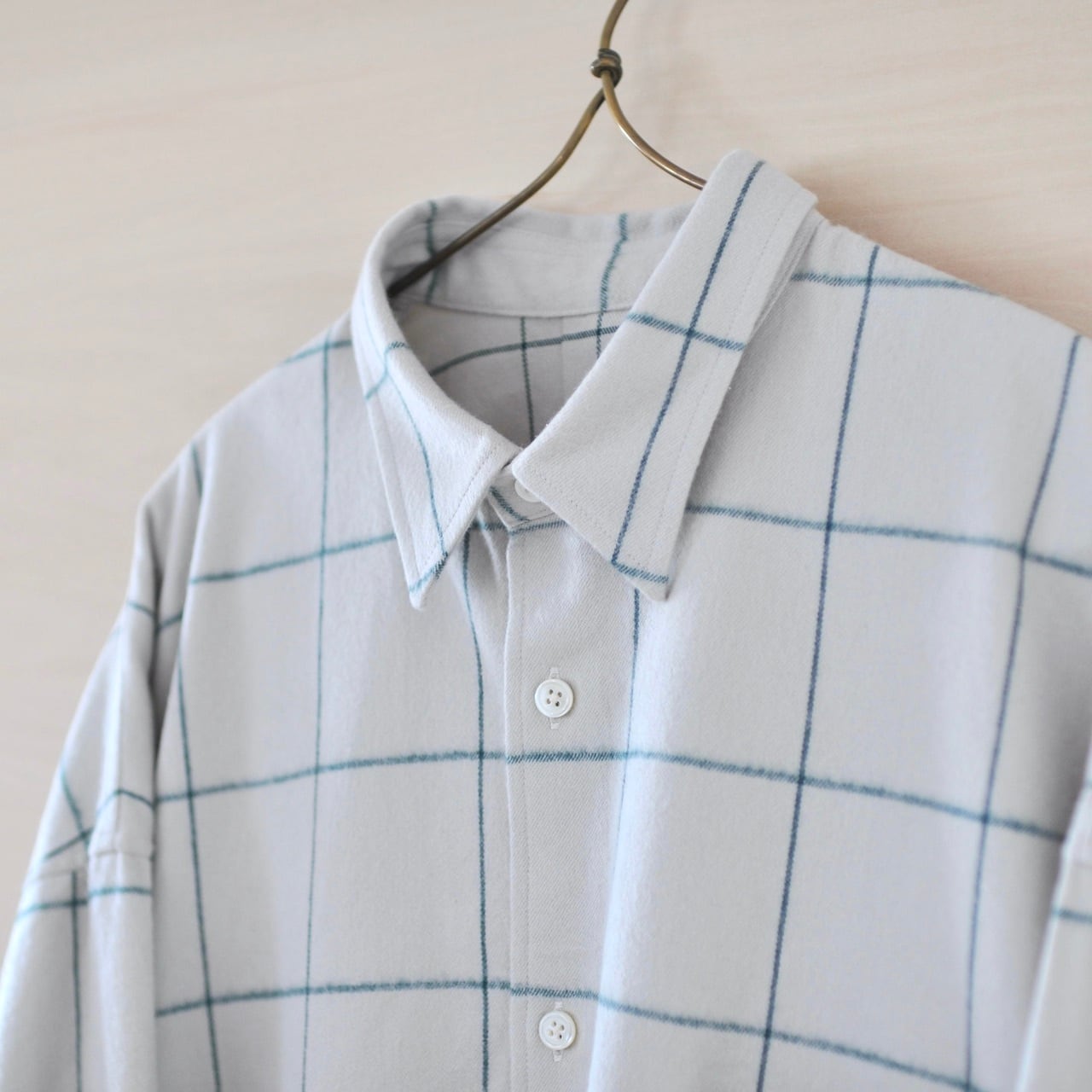 程よい毛足の長さがあるフランネルは、温かみもあり柔らかくしなやかで着心地がいいです。単色の糸で作られた生地には無い、味わい深いウィンドウペンの色合いが魅力的です。シロ.のベーシックなパターンであるオーバーサイズシャツで製作しました。製品後、一度水に通しておりますので強度な縮みはありません。お洗濯の際は、ネットに入れておしゃれ着洗いをし、脱水は30秒程でハンガー干しをお願いします。