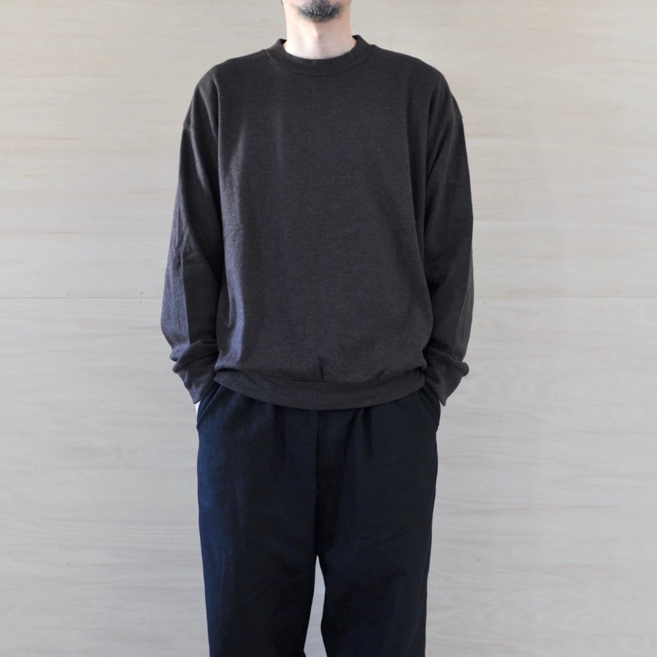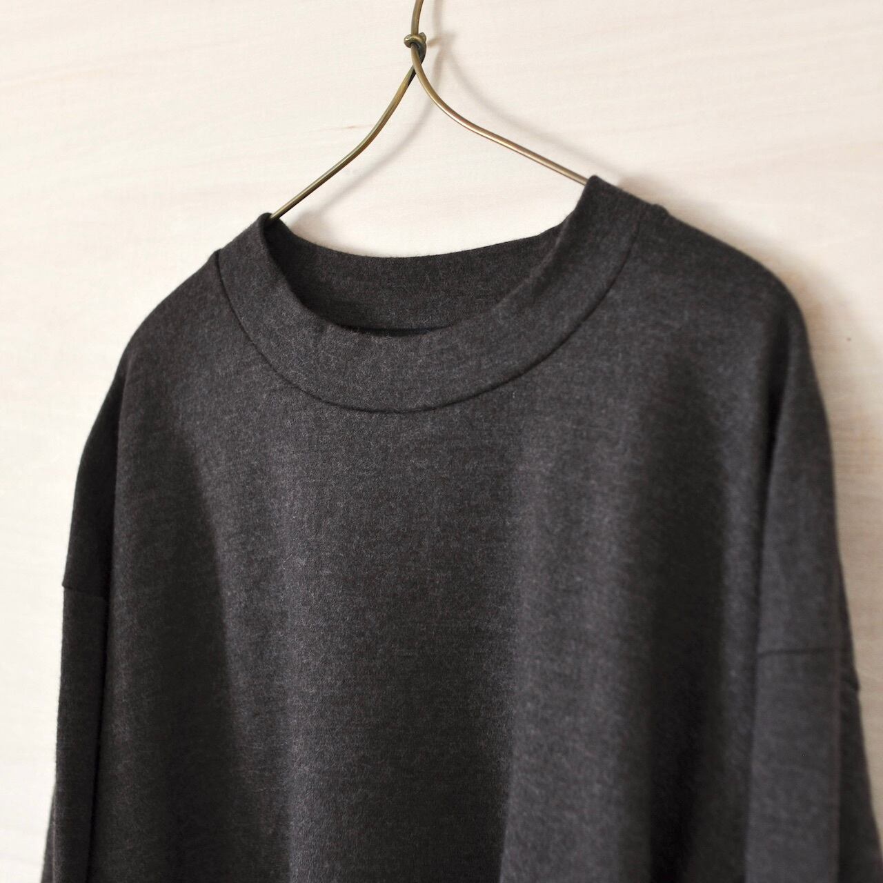 メリノウールニット生地を使用したシンプルでゆったりとしたカットソーを製作。中厚地で柔らかく重ね着をするのにも最適で、ナチュラルな伸縮もあり軽くて着心地がいいです。個人差はありますが、チクチク感も気にならないくらいです。男女兼用3サイズ展開になります。生地の縮み率を計算しながら裁断、縫製後に一度水通しを行い、極端な縮みがおこらないように施しておりますが、洗濯はクリーニングでお願い致します。