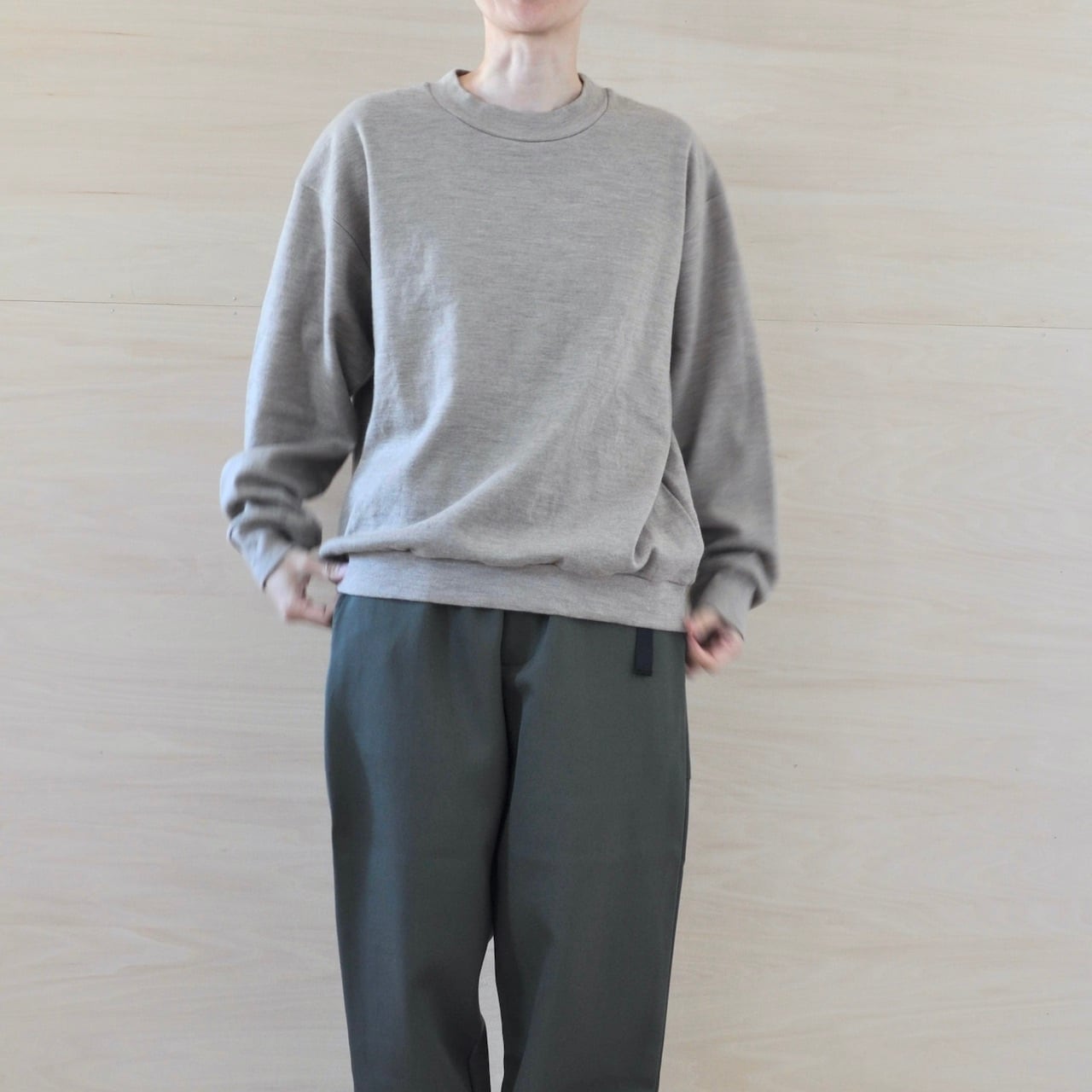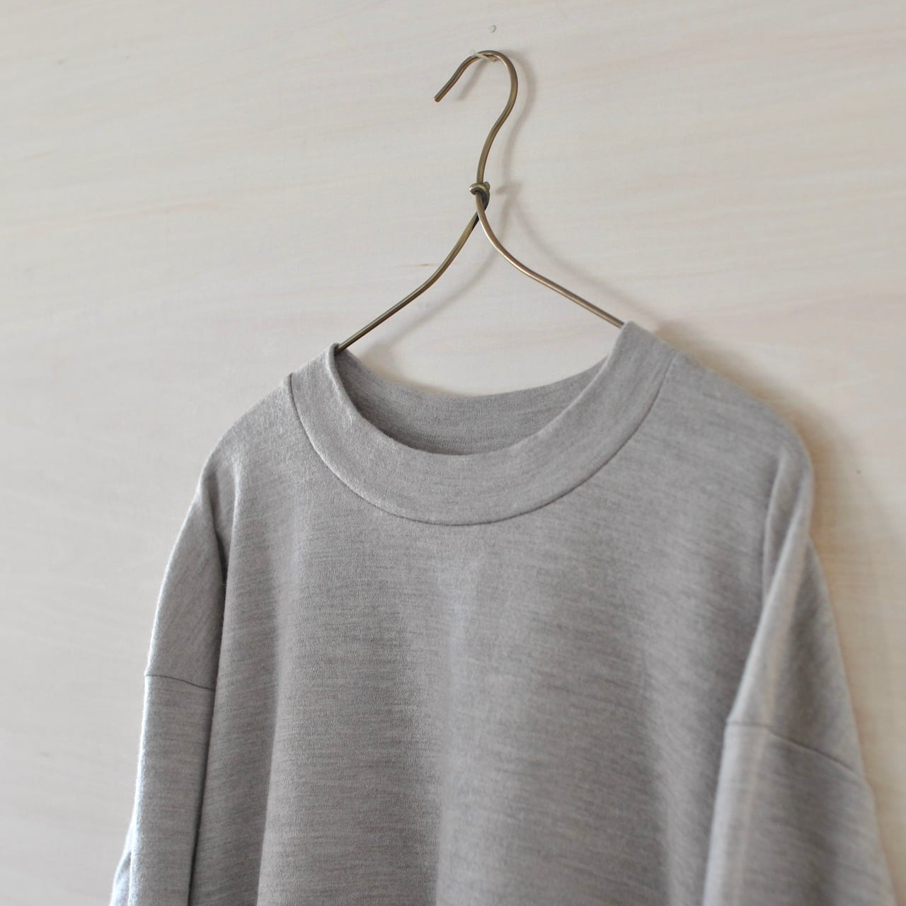メリノウールニット生地を使用したシンプルでゆったりとしたカットソーを製作。中厚地で柔らかく重ね着をするのにも最適で、ナチュラルな伸縮もあり軽くて着心地がいいです。個人差はありますが、チクチク感も気にならないくらいです。男女兼用3サイズ展開になります。生地の縮み率を計算しながら裁断、縫製後に一度水通しを行い、極端な縮みがおこらないように施しておりますが、洗濯はクリーニングでお願い致します。